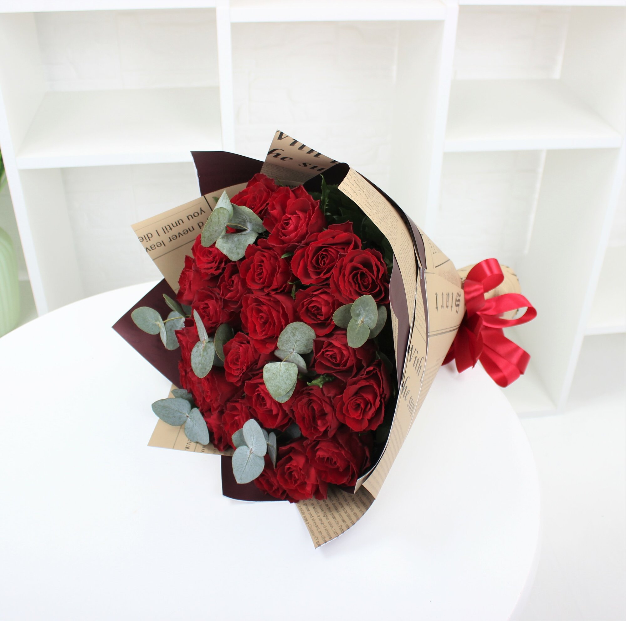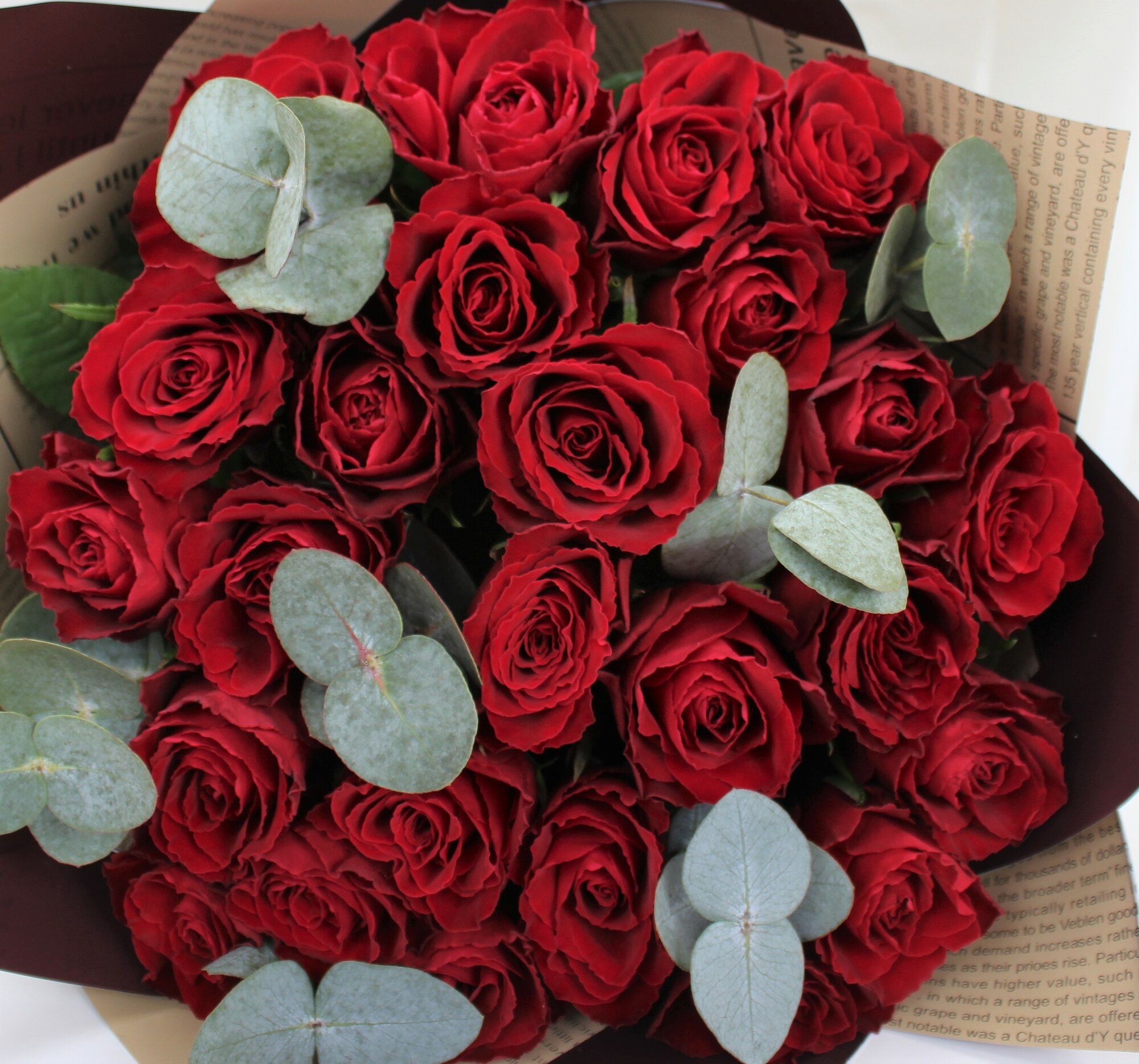 Купить 25 красных роз 40см с эвкалиптом