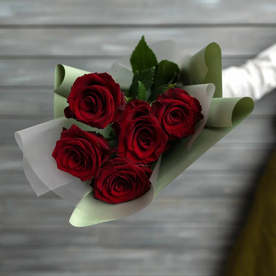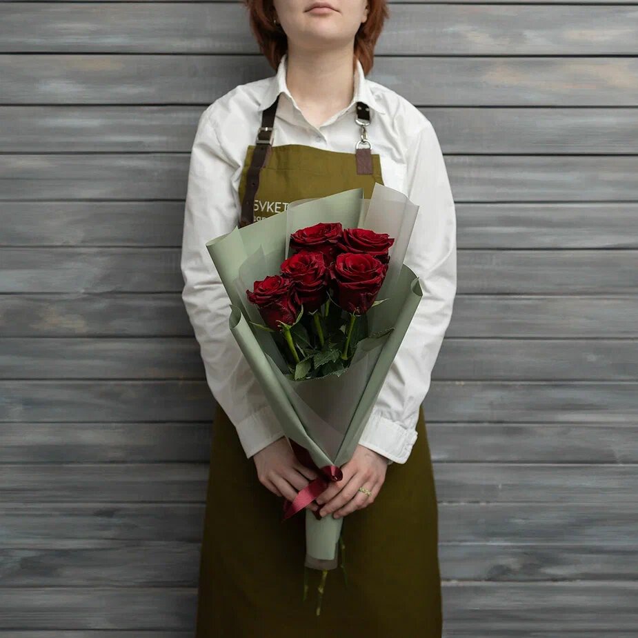 Купить Букет живых цветов из 5 красных роз в упаковке Эквадор 60 см