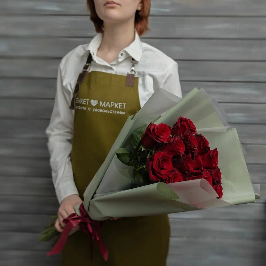 Купить Букет живых цветов из 15 красных роз в упаковке Эквадор 60 см