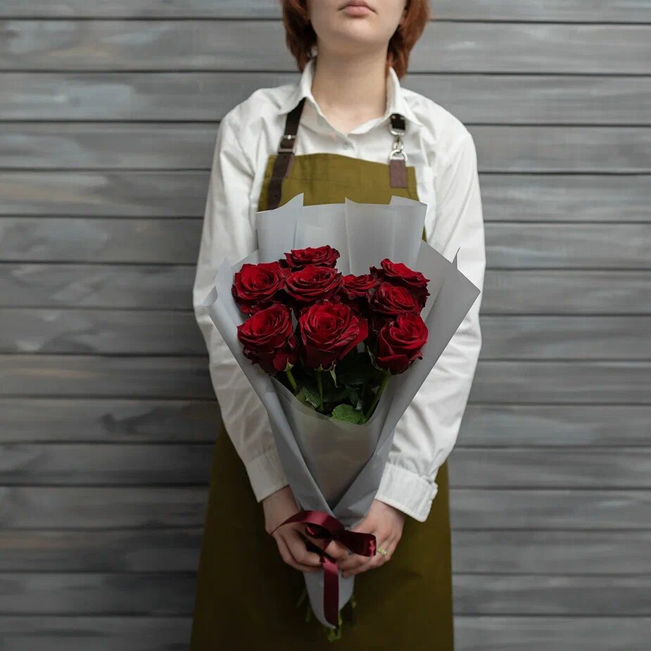 Купить Букет живых цветов из 9 красных роз в упаковке Эквадор 60 см