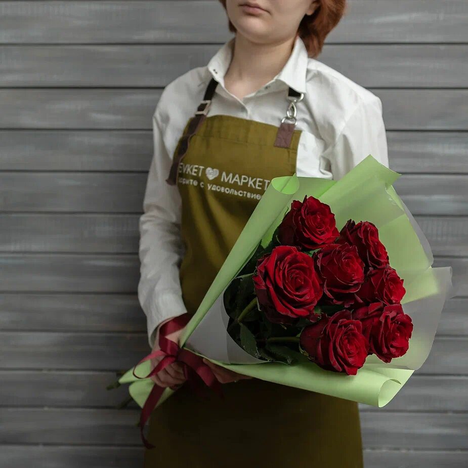 Купить Букет живых цветов из 7 красных роз в упаковке Эквадор 60 см