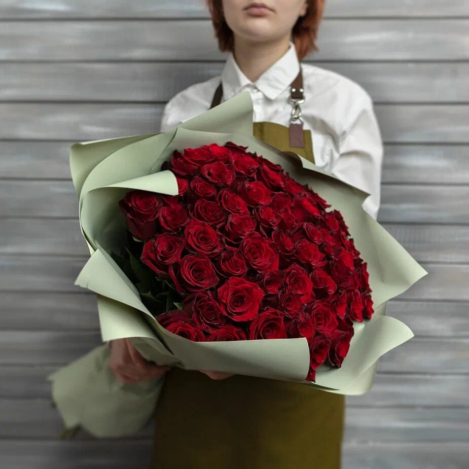 Купить Букет живых цветов из 51 красной розы в упаковке Эквадор 60 см