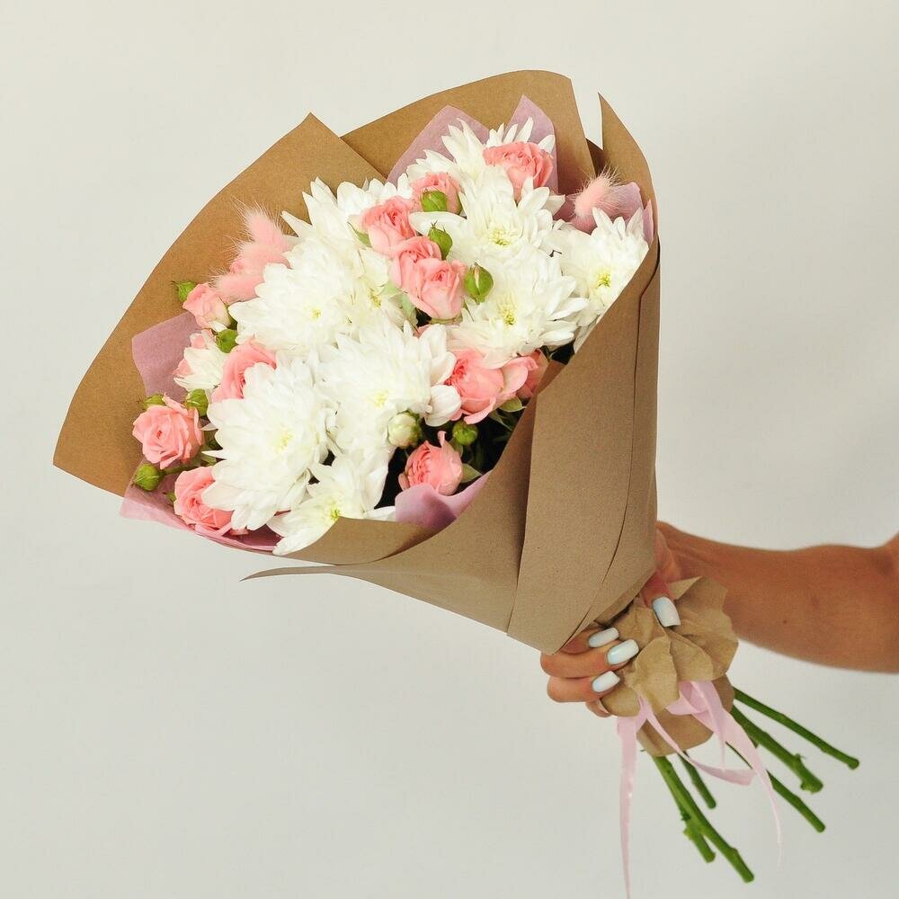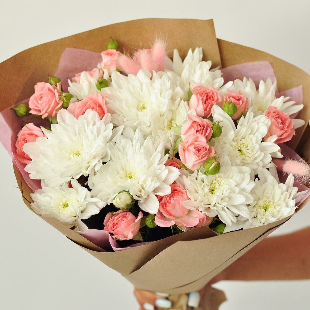 Хризантема и кустовые розы в букете Персиковый поцелуй интересное: