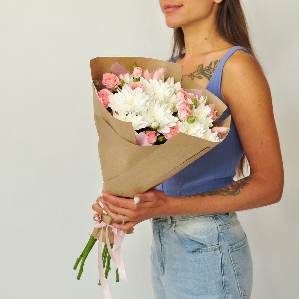 Букет из 17 свежих, бело-розовых кустовых гвоздик микс, 55 см+ в упаковке крафт