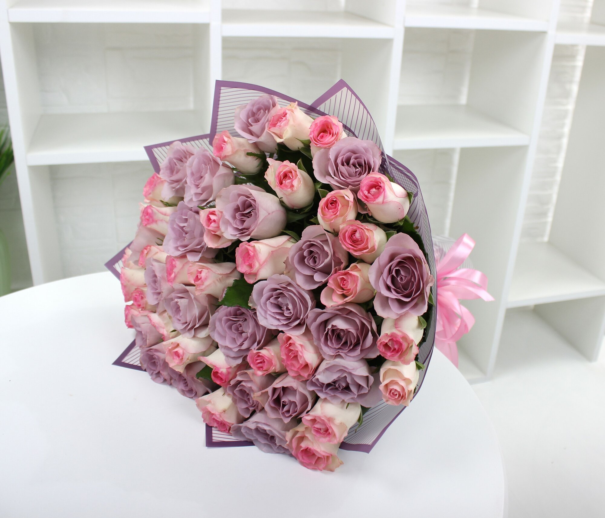 Купить 51 бело-розовая и сиреневая роза 40см