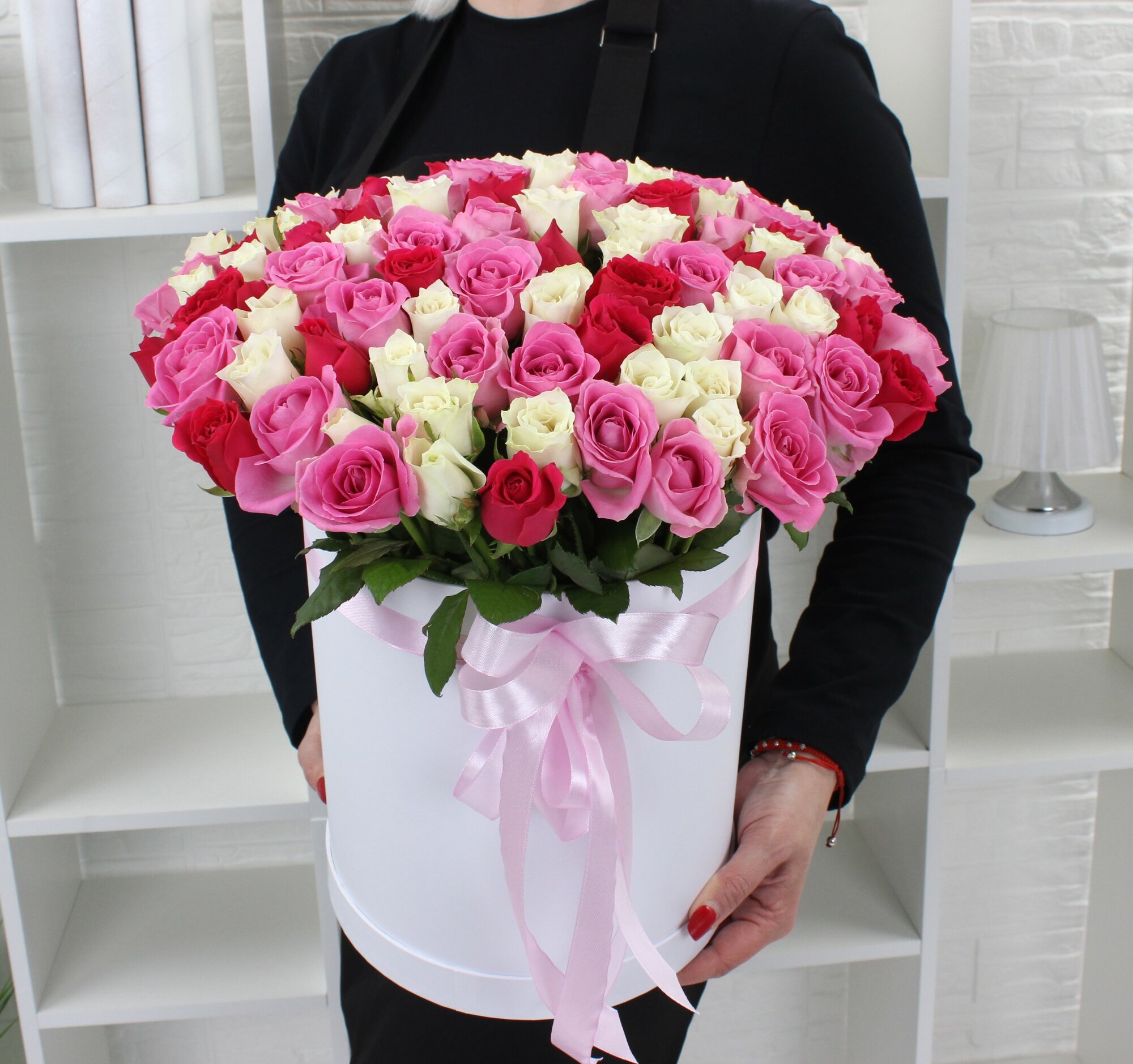 Купить 101 розовая, белая, малиновая роза в шляпной коробке