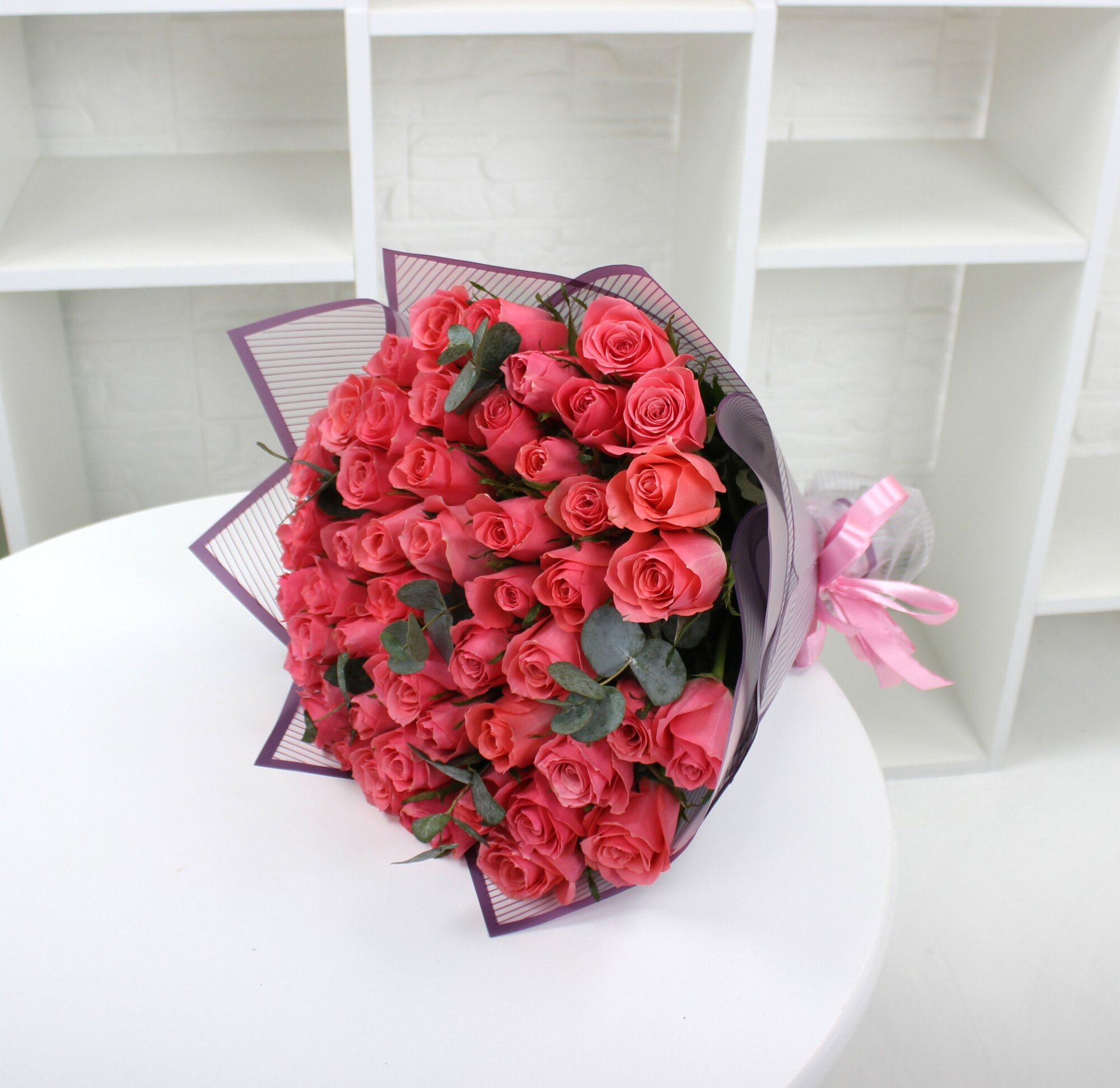 Купить 51 розовая роза 40см с эвкалиптом
