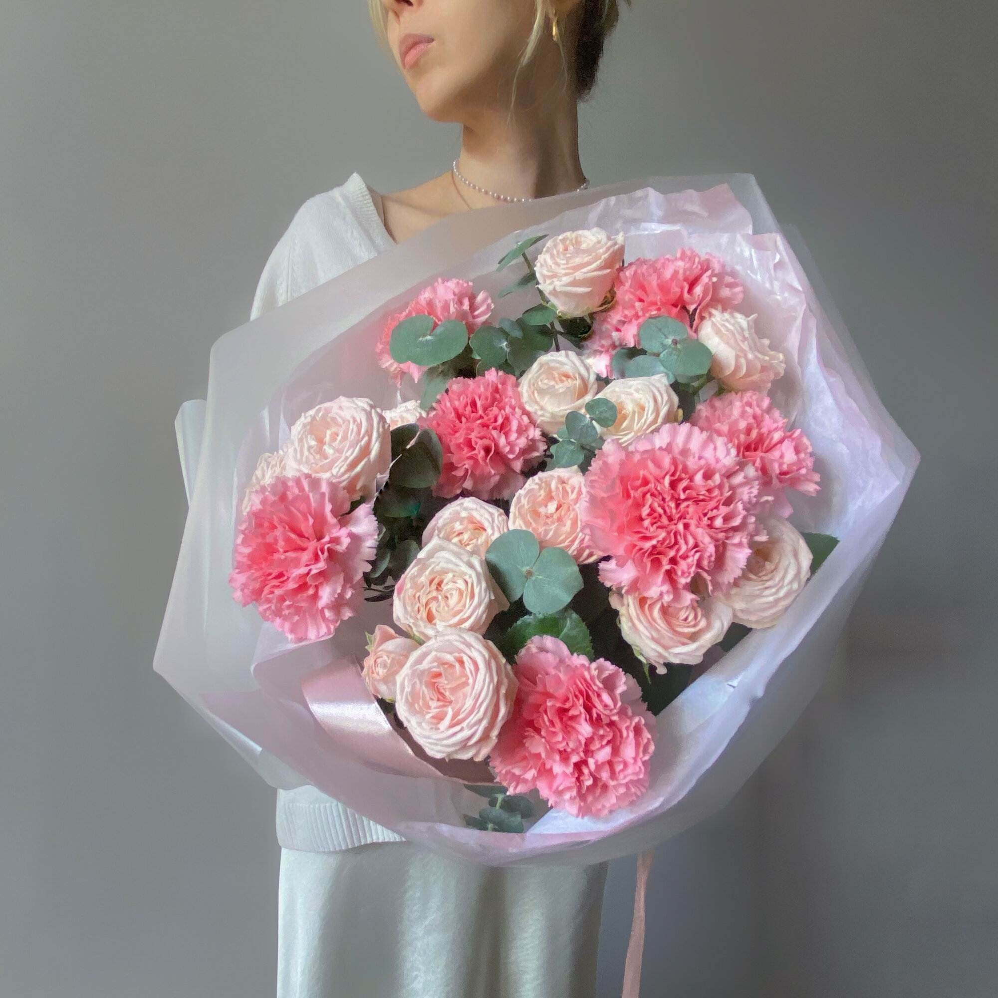 Нежный букет с пионовидными розами и диантусами в авторской упаковке. Размер L