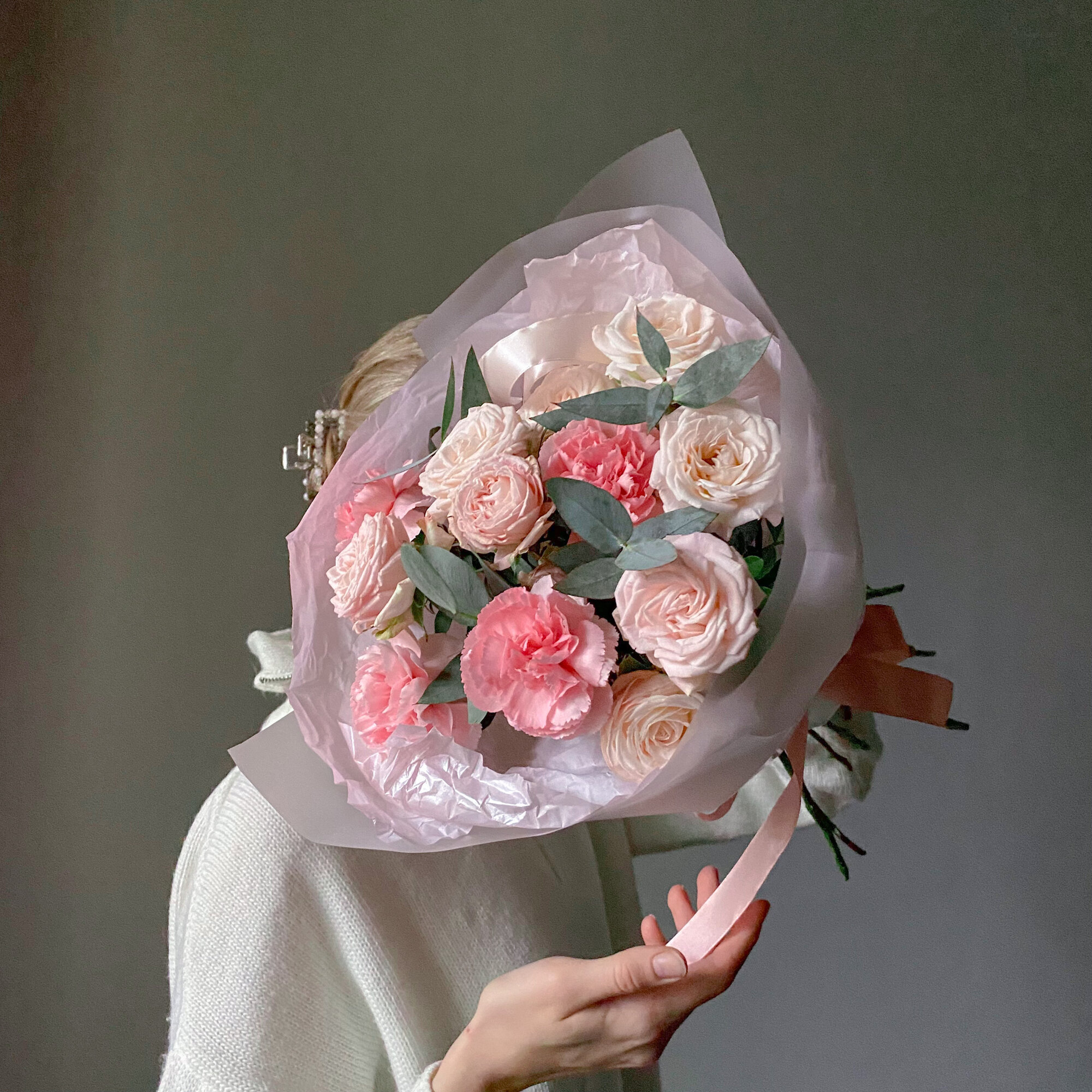 Нежный букет с пионовидными розами, эвкалиптом и диантусами в авторской упаковке интересное: