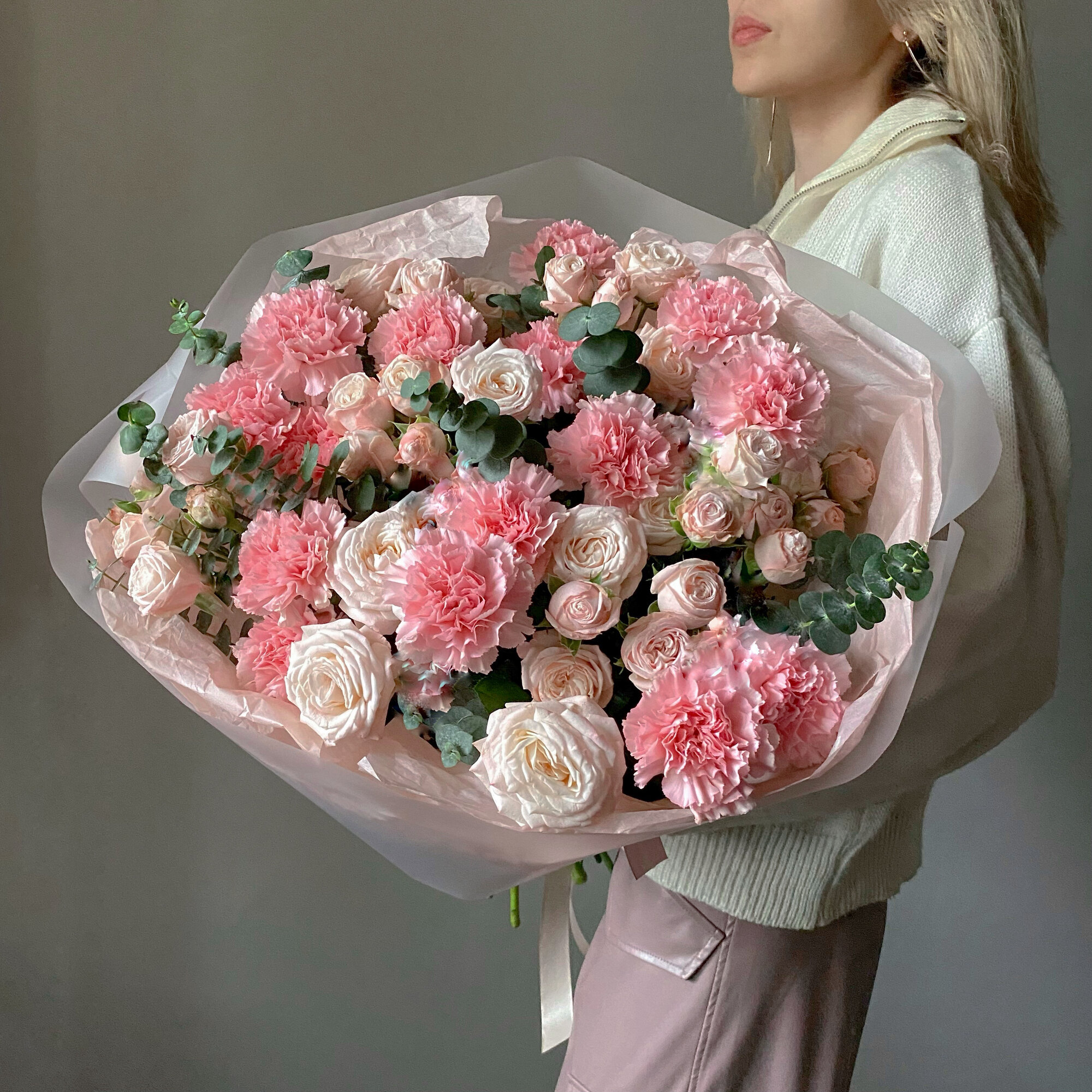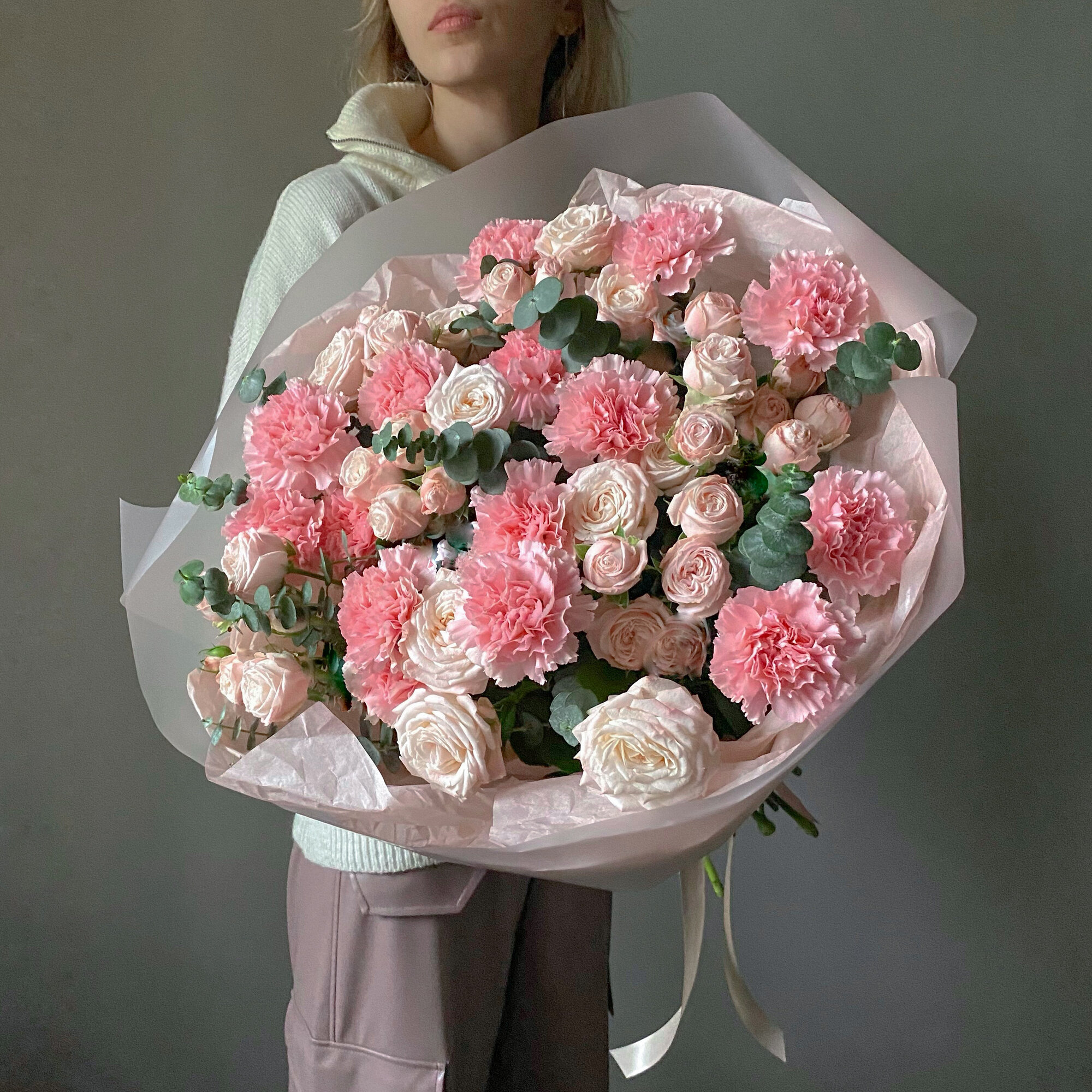 Нежный букет с пионовидными розами, эвкалиптом и диантусами в авторской упаковке