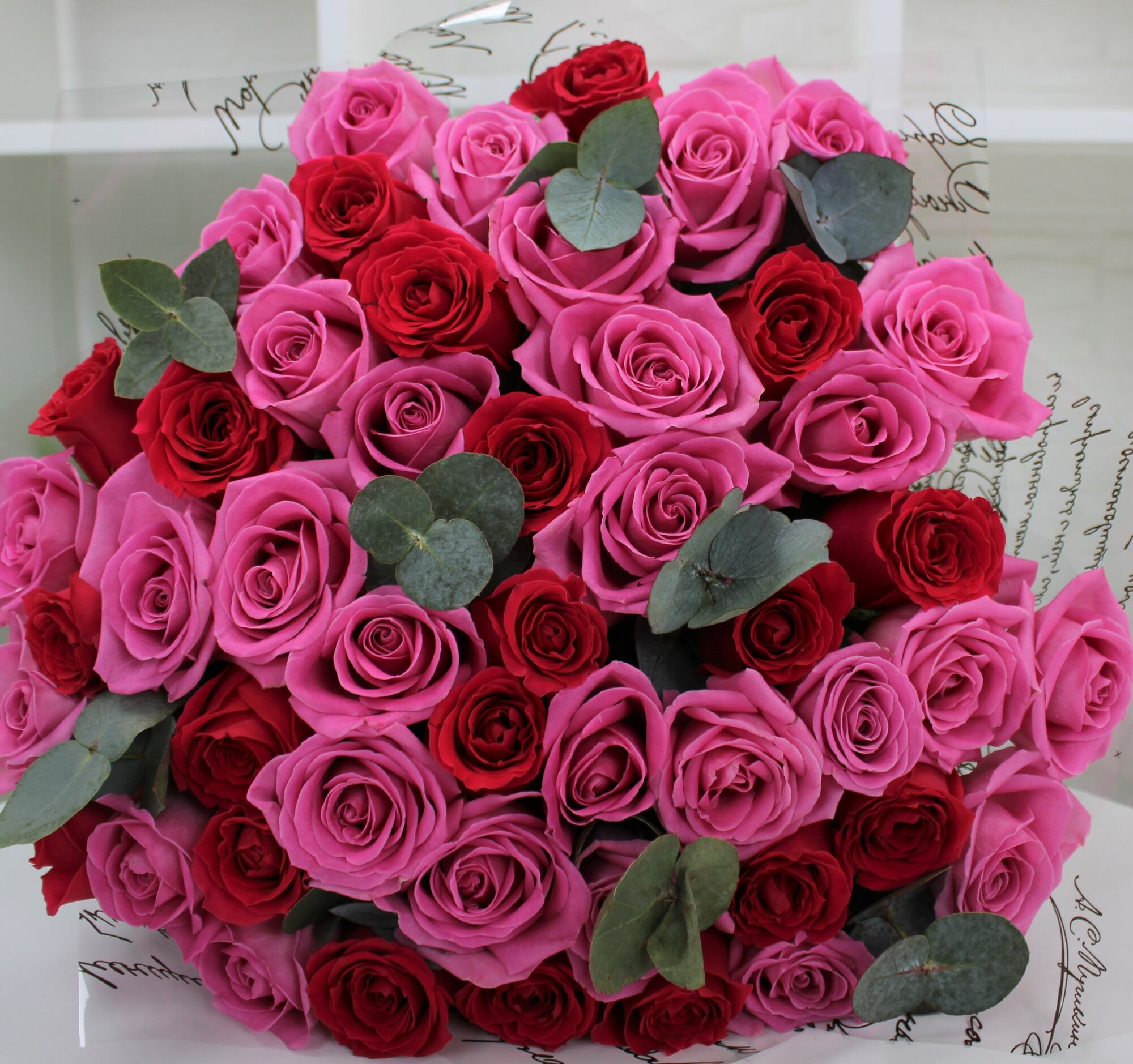 Купить 51 розовая и малиновая роза 40см с эвкалиптом