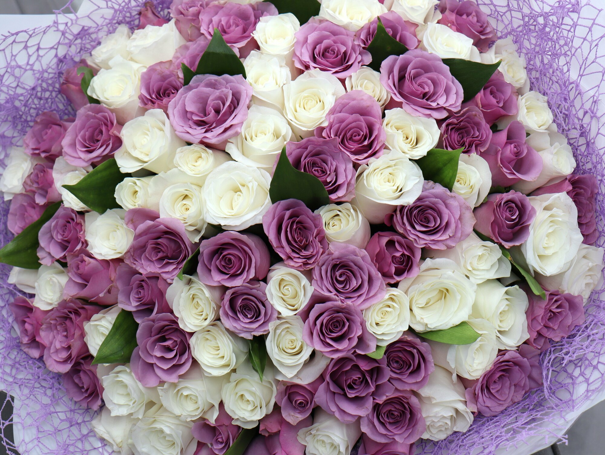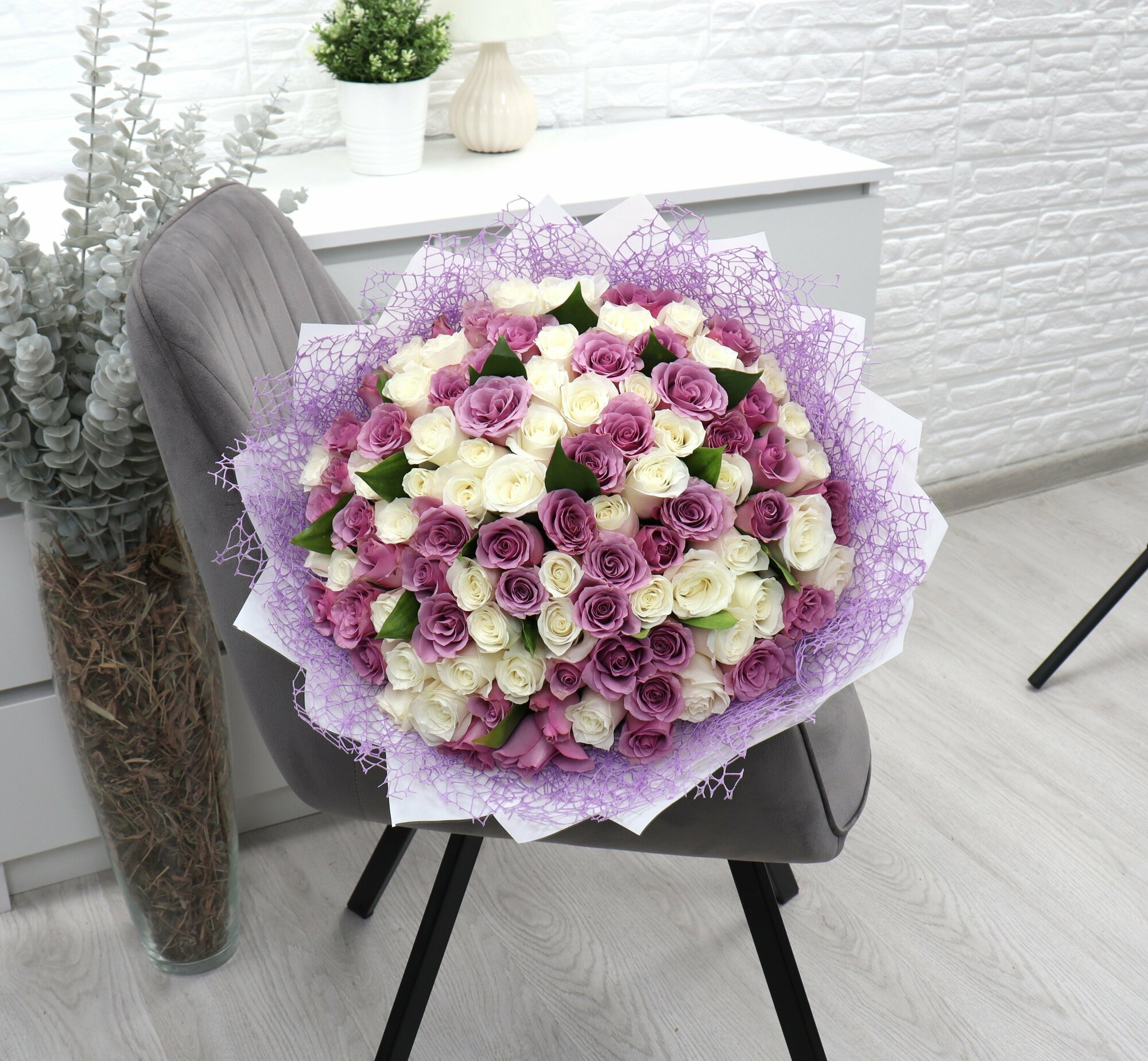 101 белая и фиолетовая роза 40см с зеленью интересное: