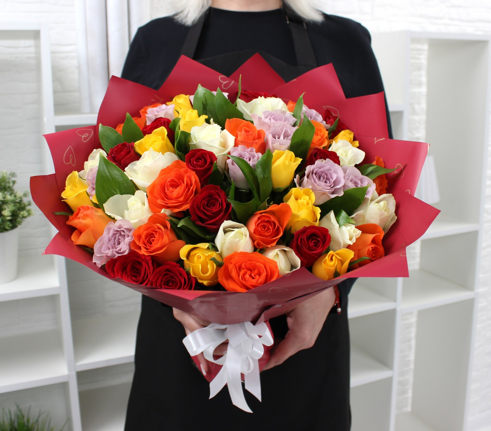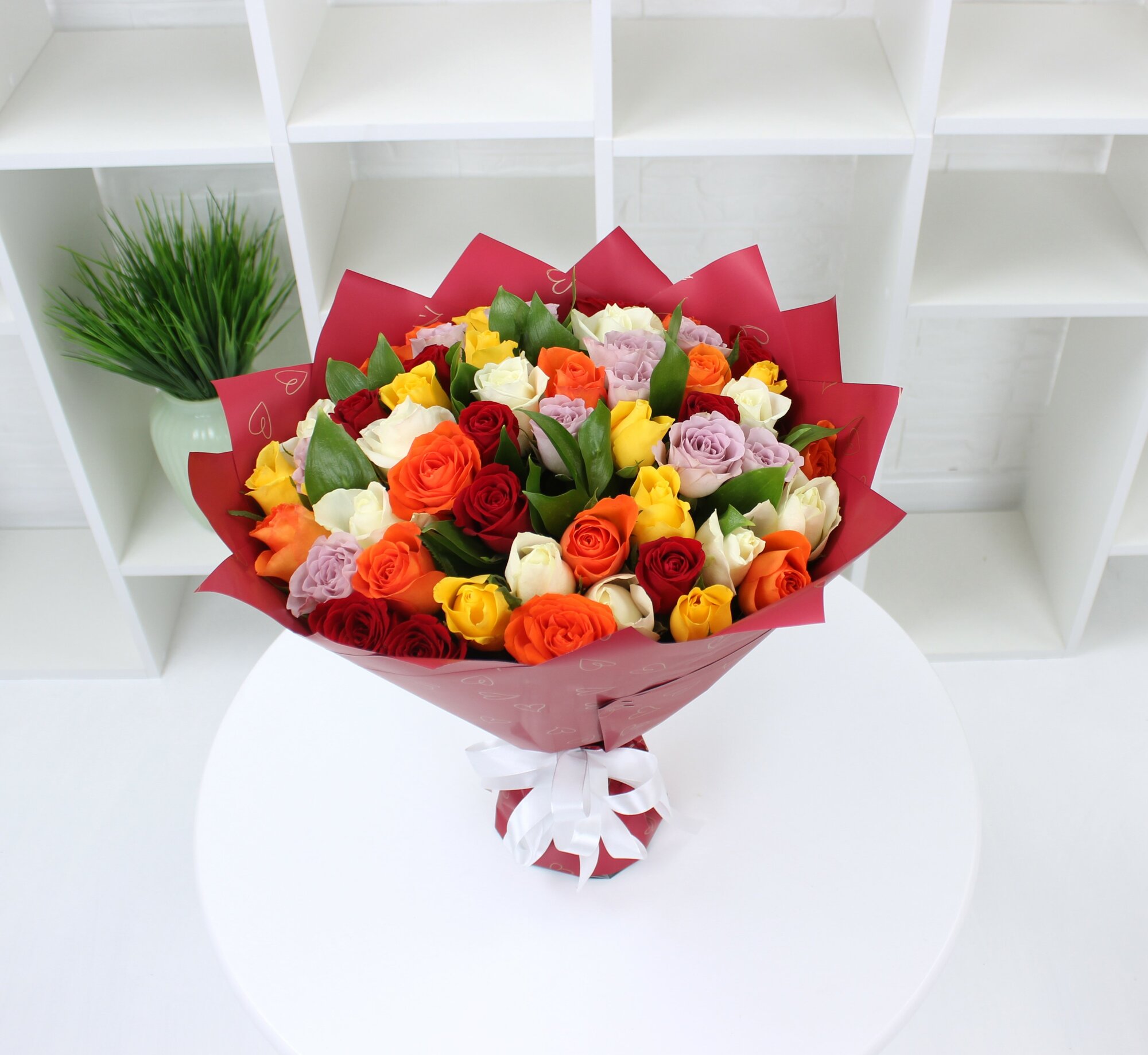 Купить 51 разноцветная роза 40см с зеленью