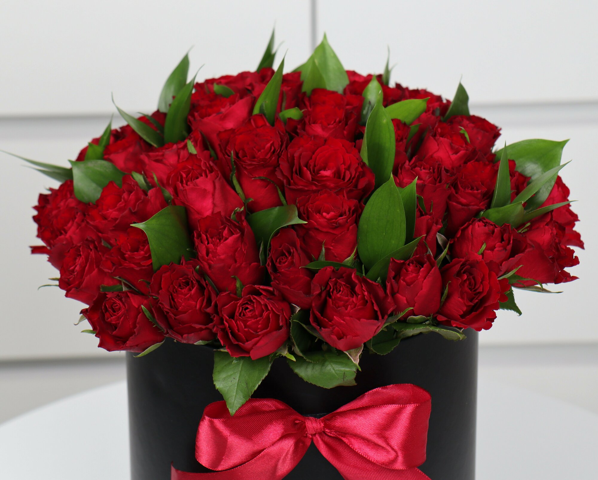 Купить 51 красная роза с зеленью в шляпной коробке