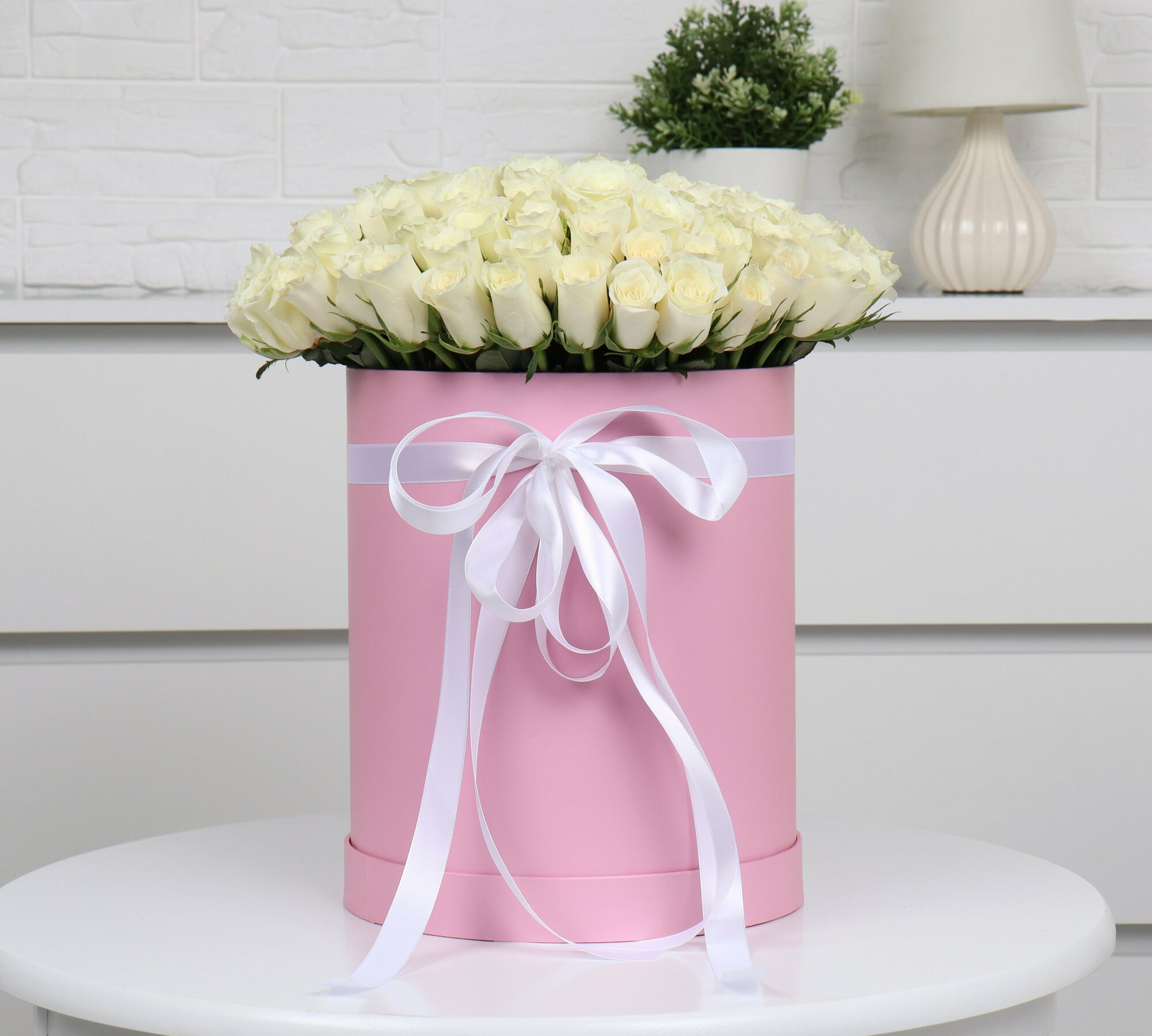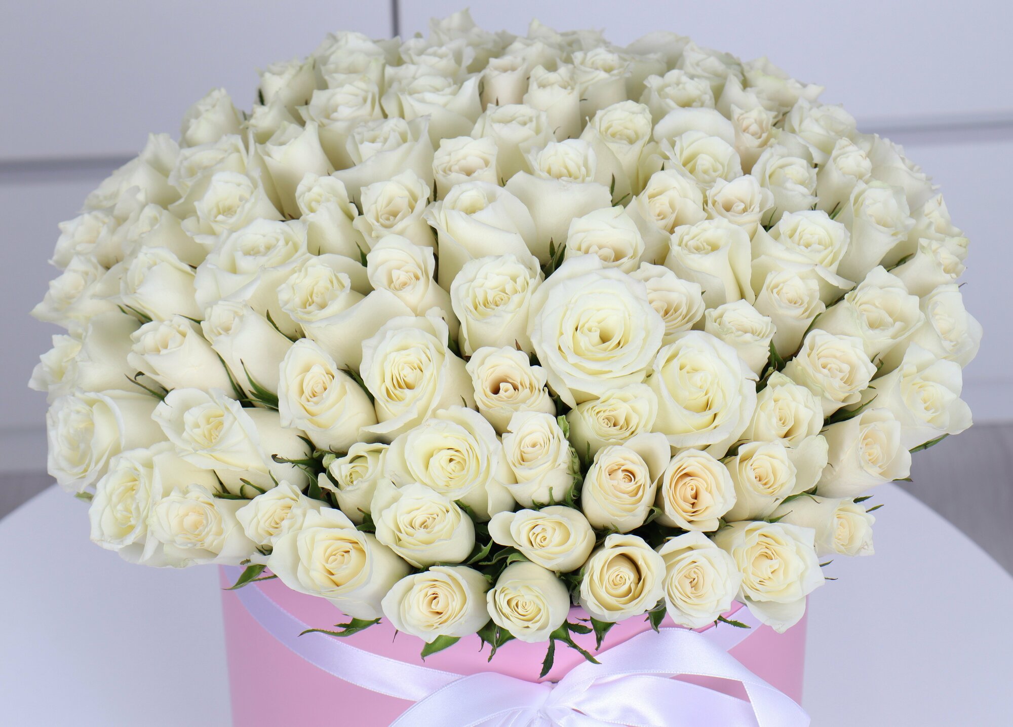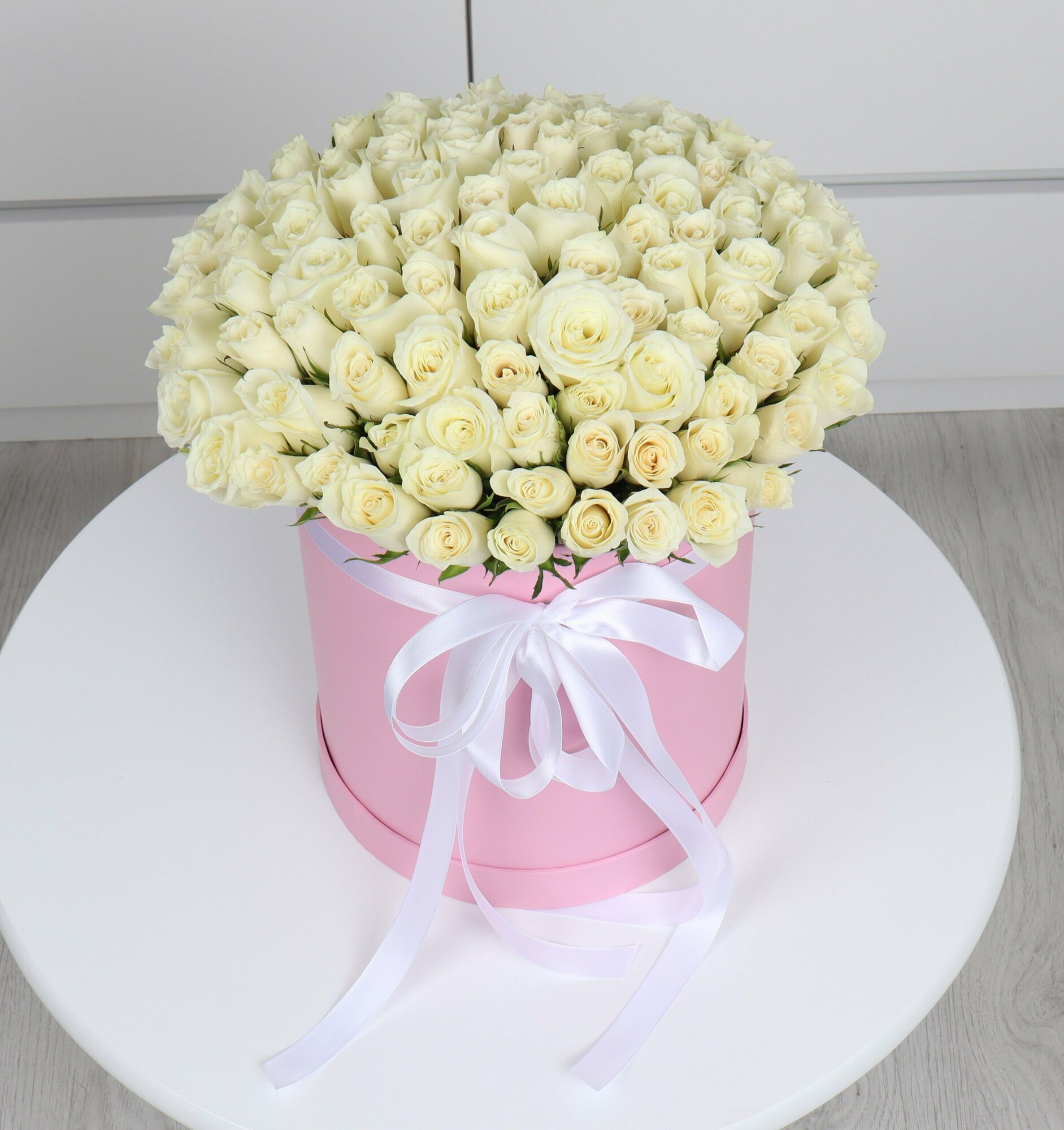 101 белая роза в шляпной коробке интересное:
