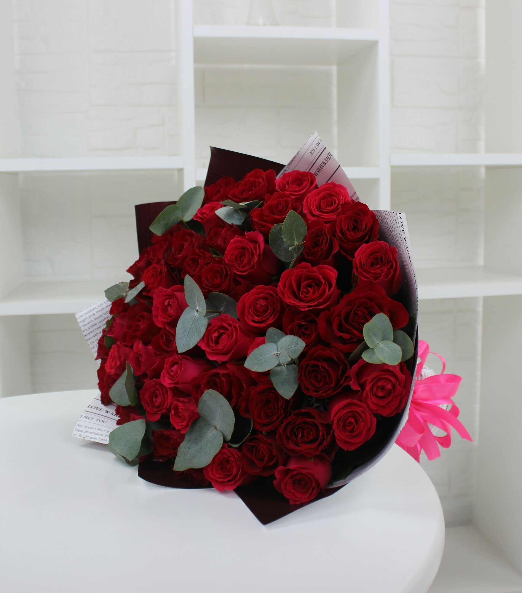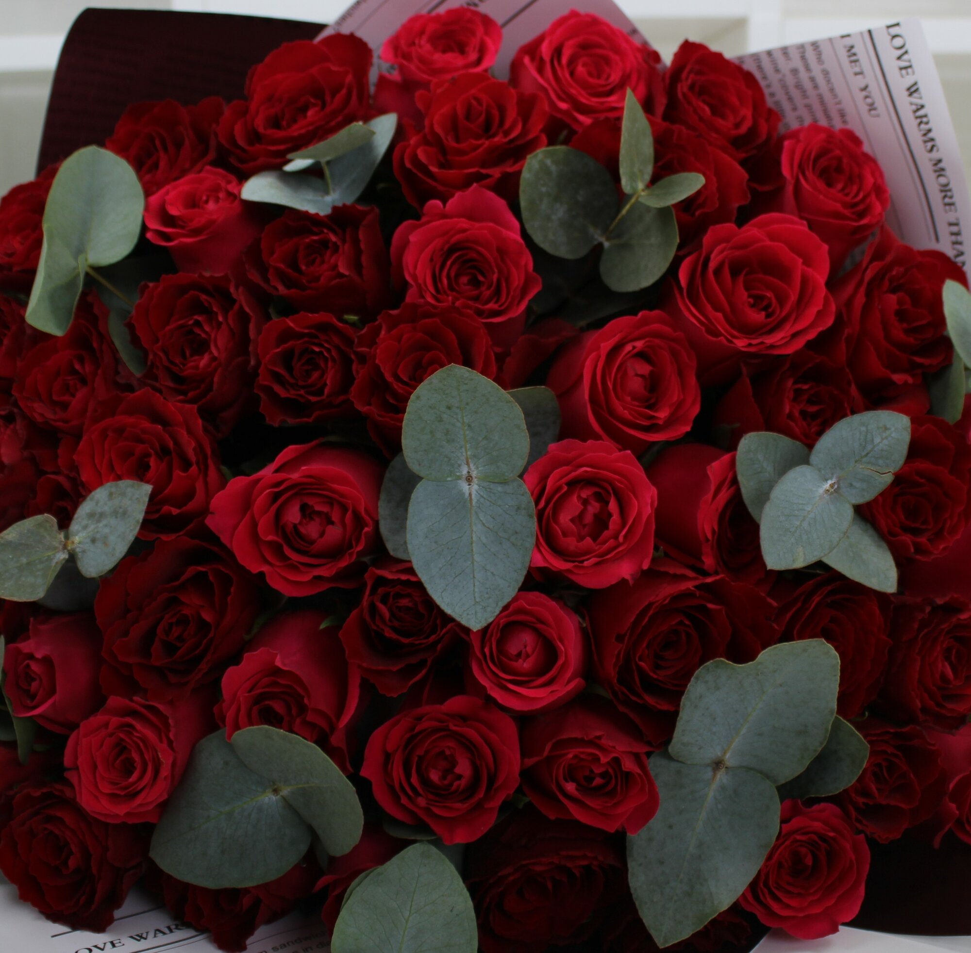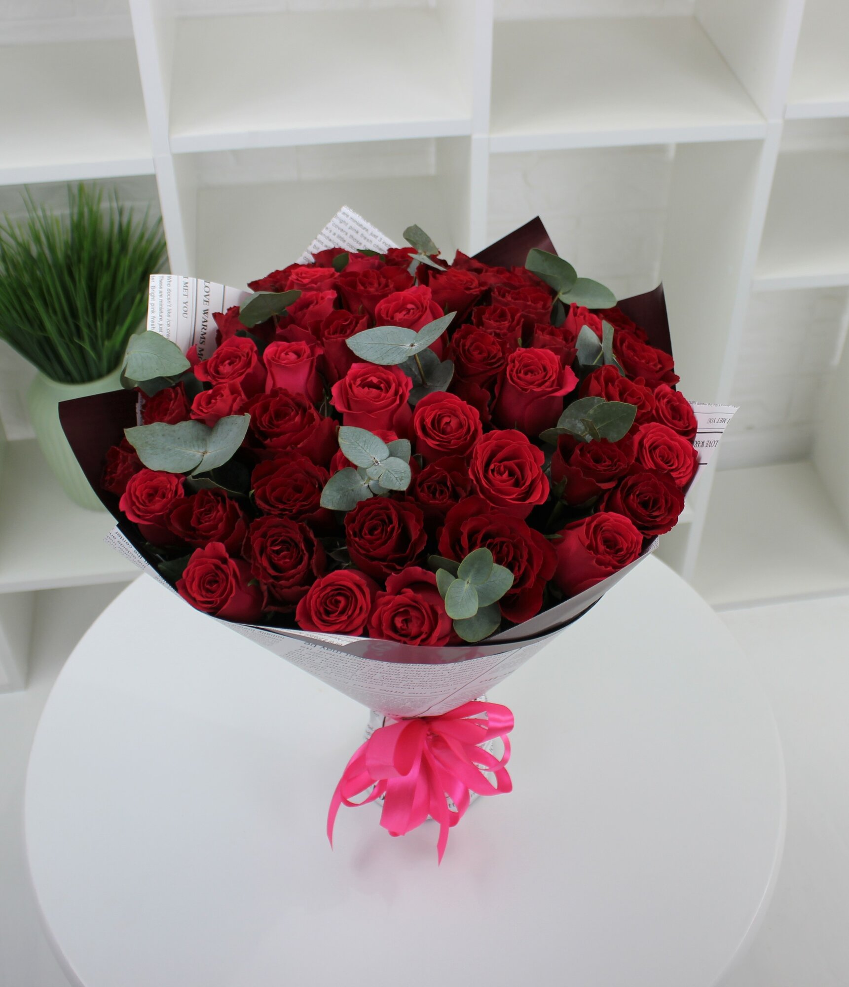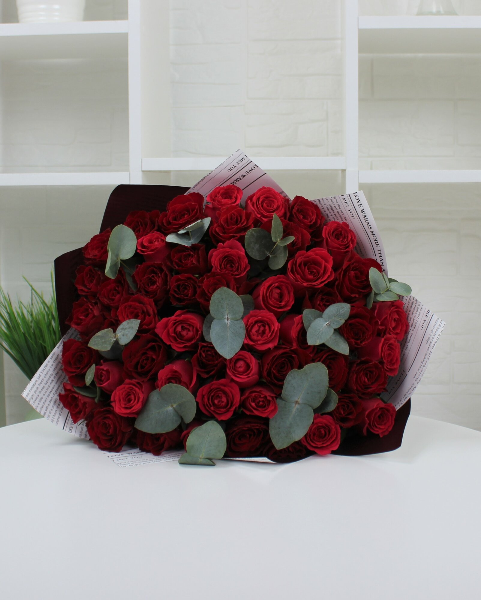 Купить 51 красная и малиновая роза 40см с эвкалиптом