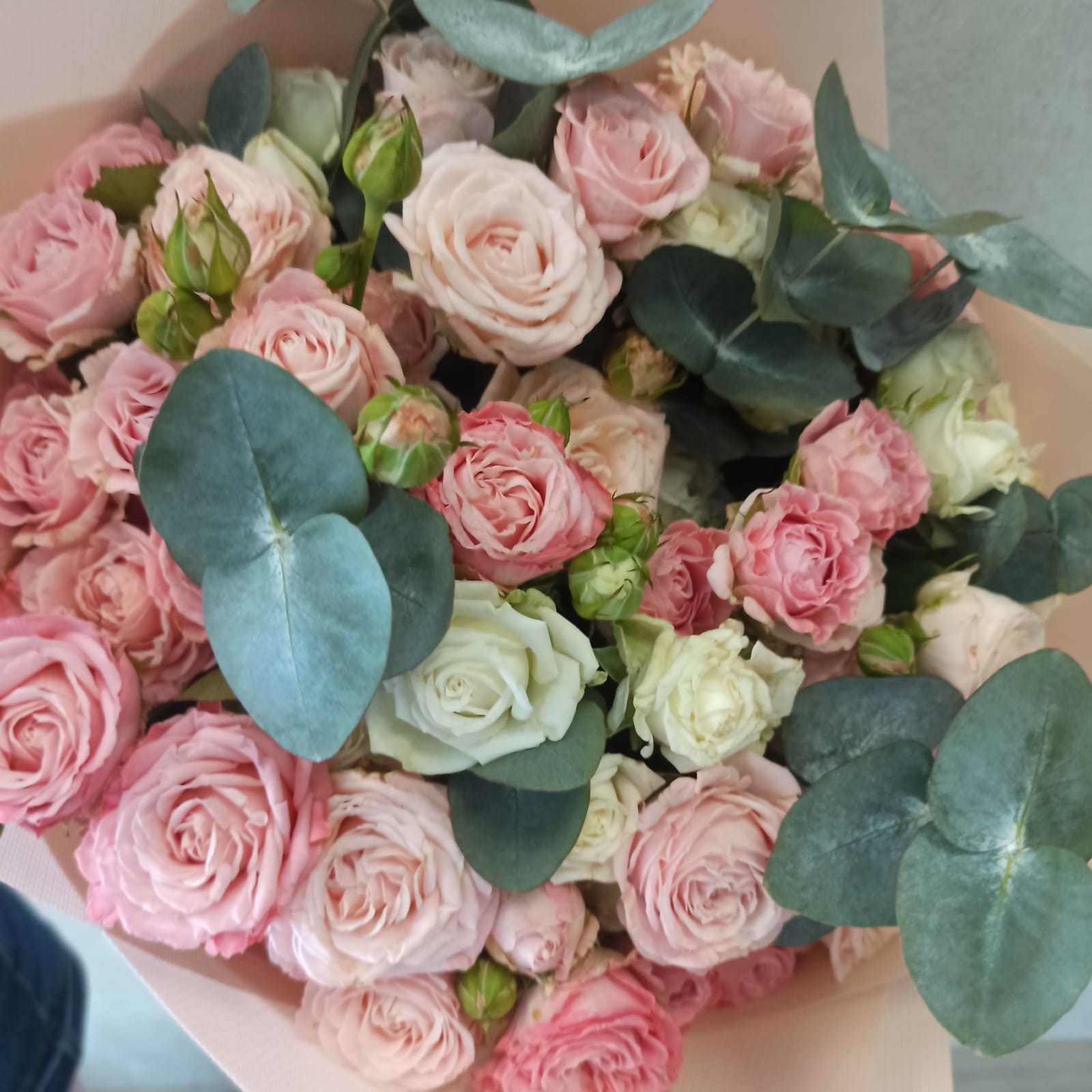 Живые цветы букет розовых кустовых роз в упаковке 17 шт. 40 см. "Флирт" интересное: