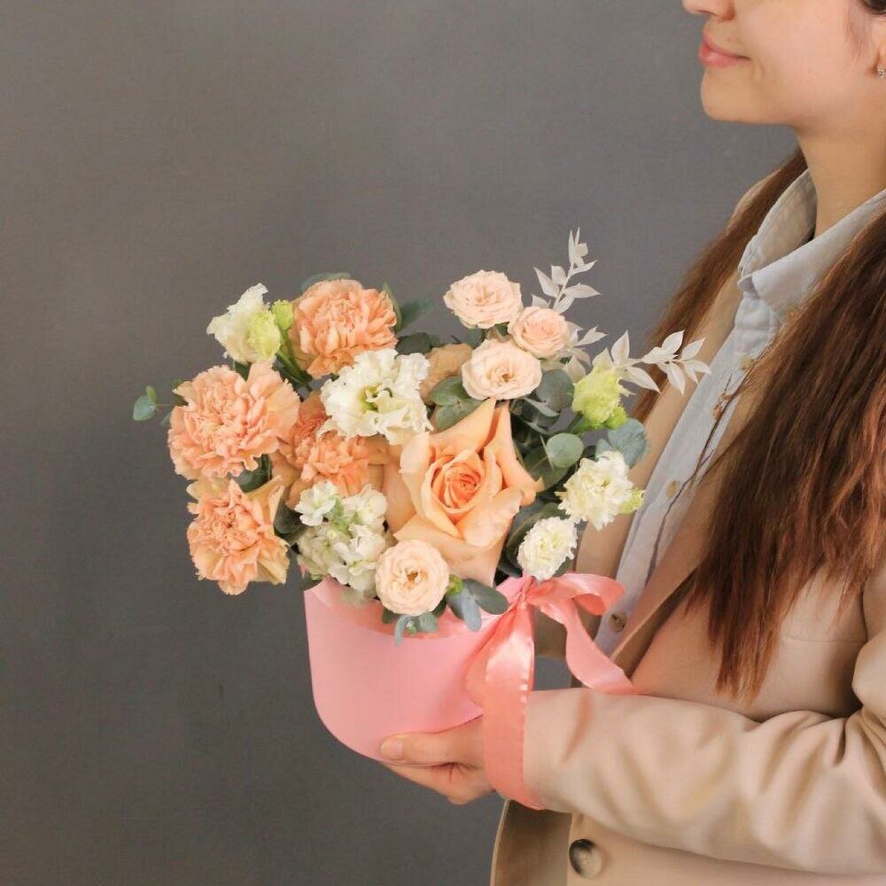 Букет цветов от Kimbirly Flowers в коробке из французской и кустовой розы, эустомы, гвоздики, маттиолы, цвет персиковый интересное: