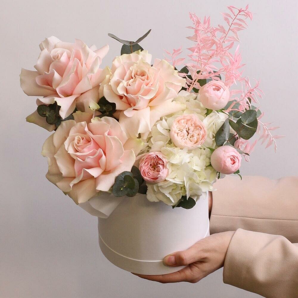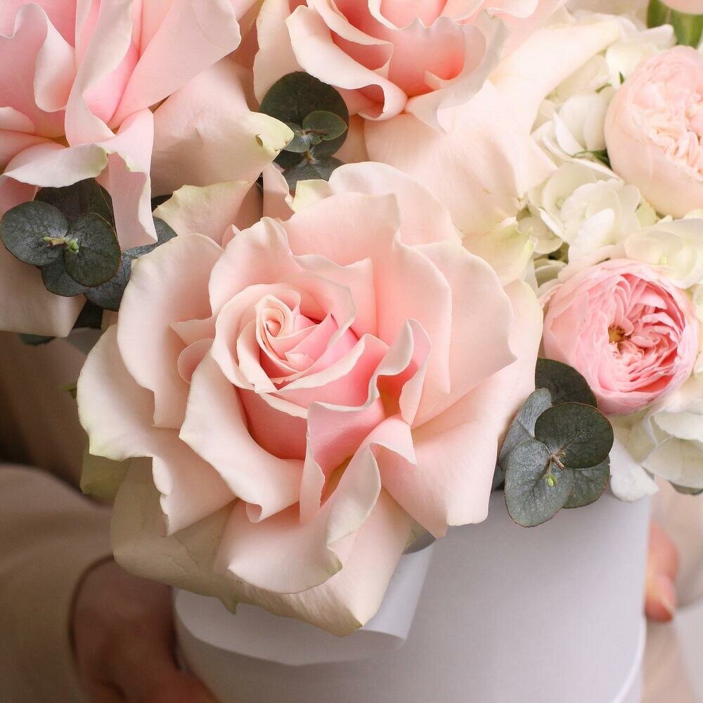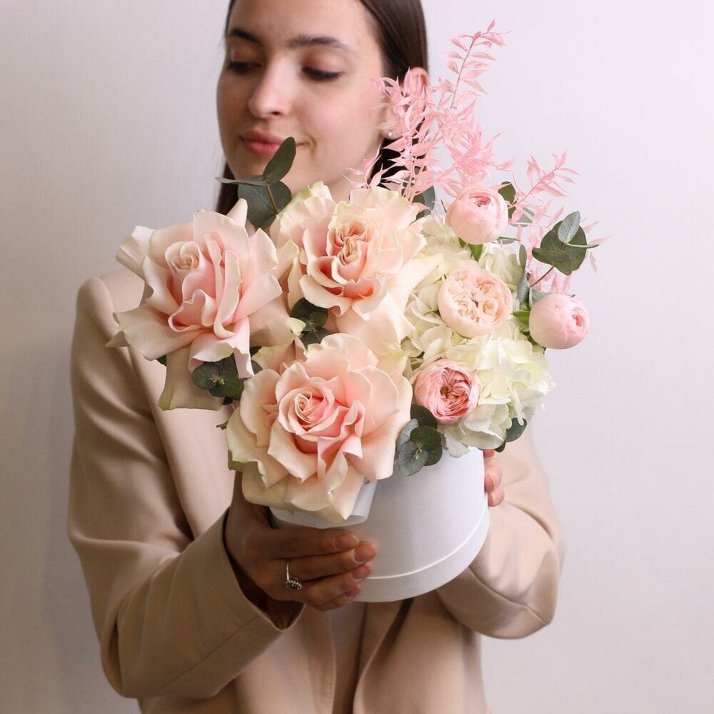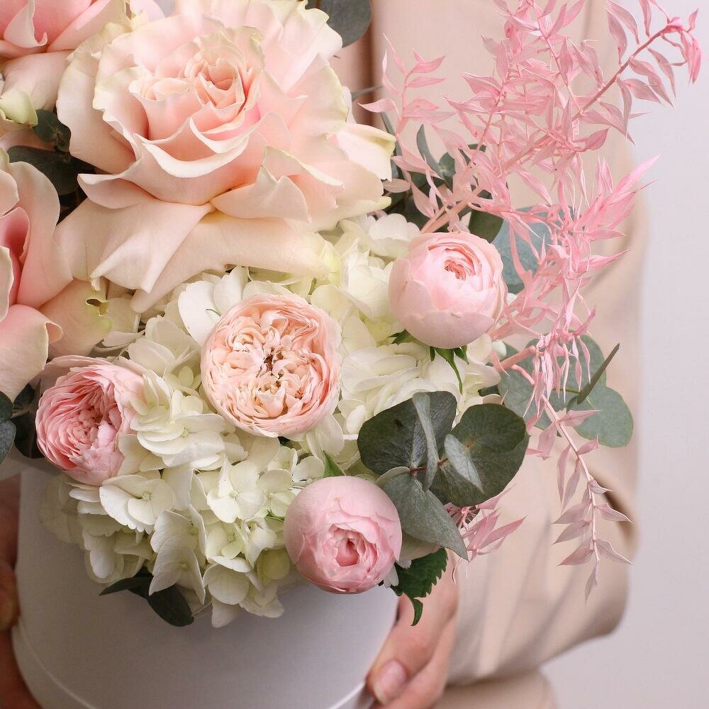 Букет цветов от Kimbirly Flowers в коробке из французской и пионовидной розы, гортензии, эвкалипта, цвет розовый, белый интересное: