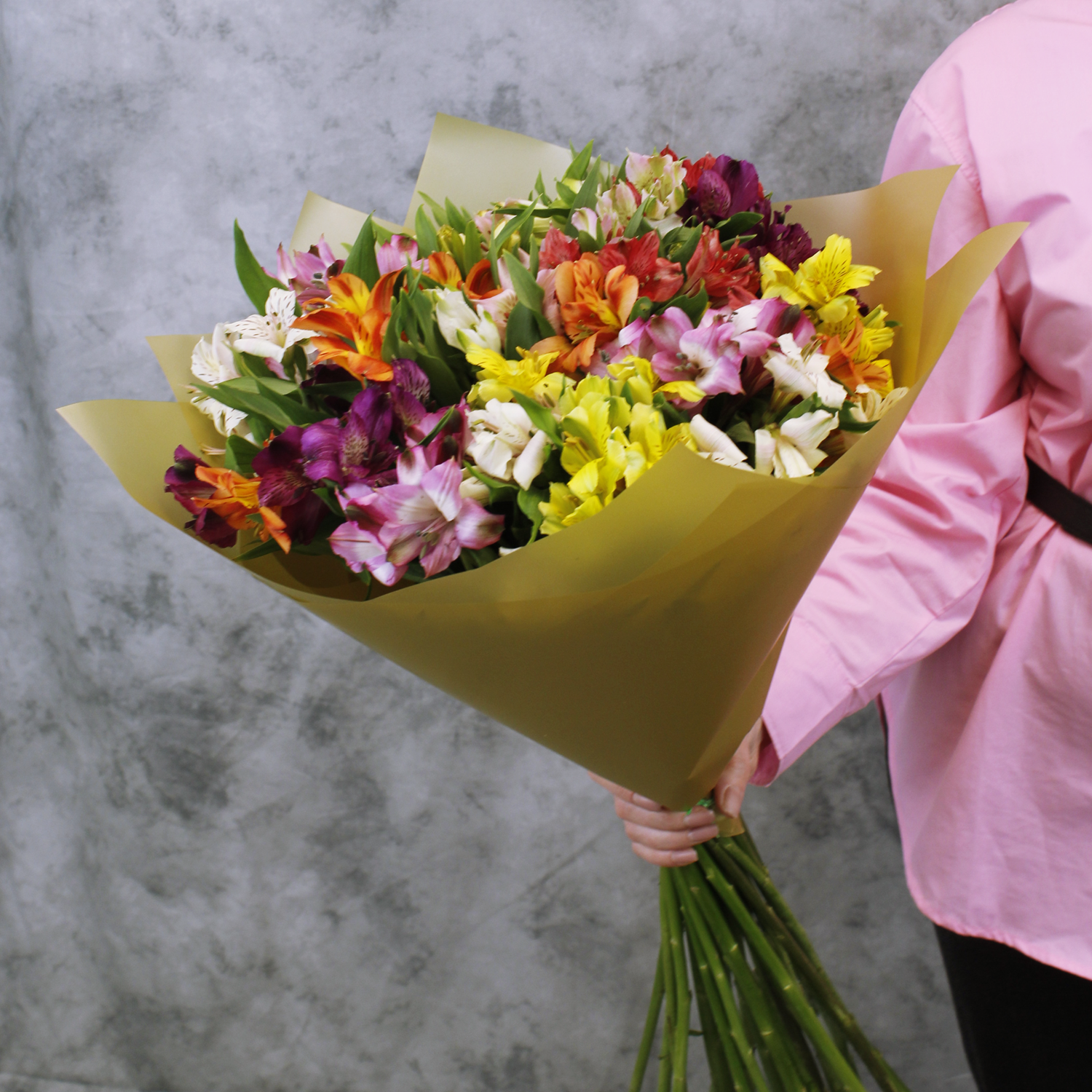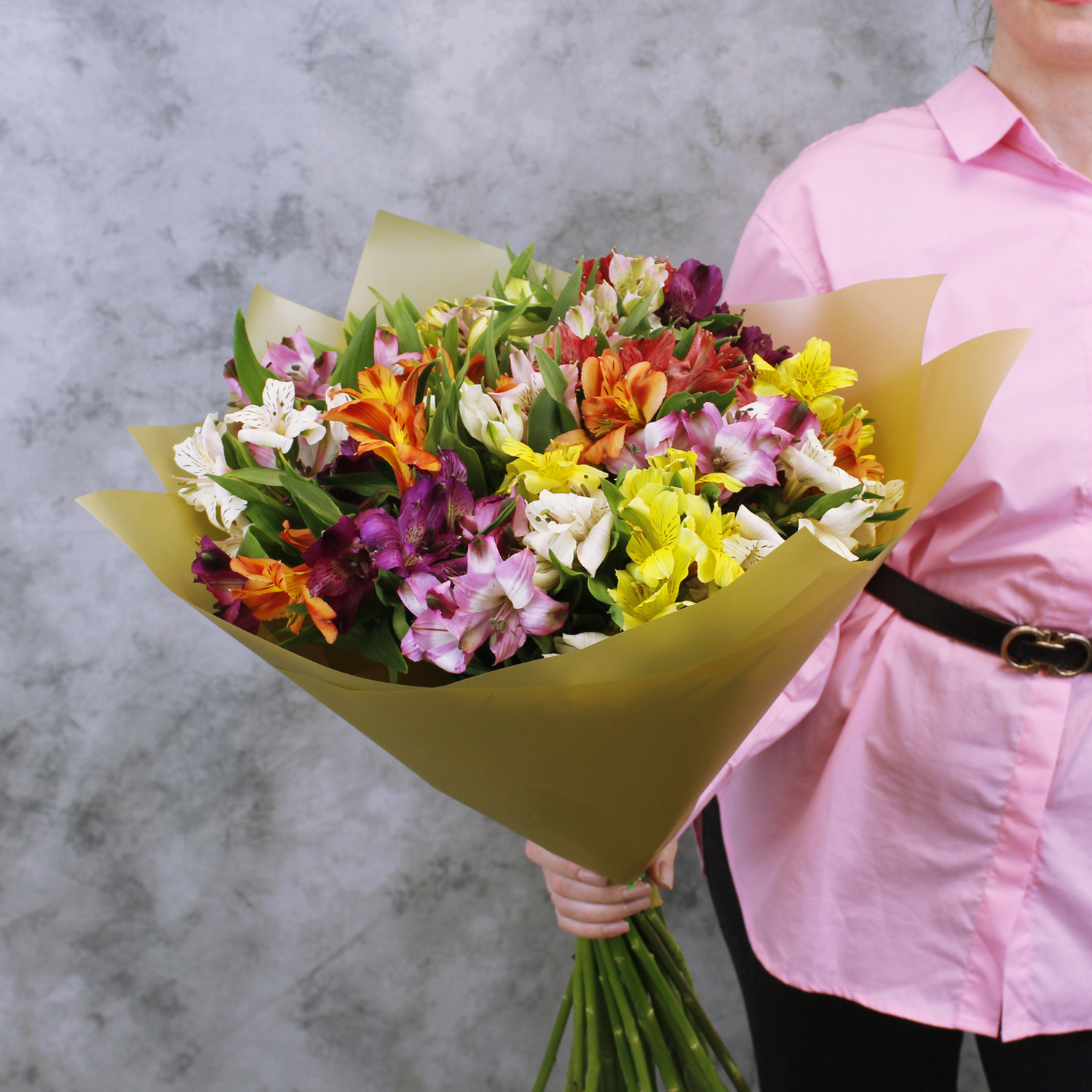 Купить Классический яркий букет из 25 альстромерий микс в матовой пленке с атласной лентой от 2name Flowers