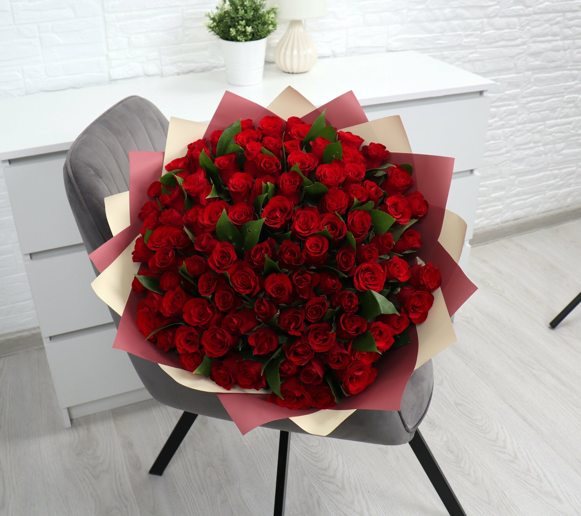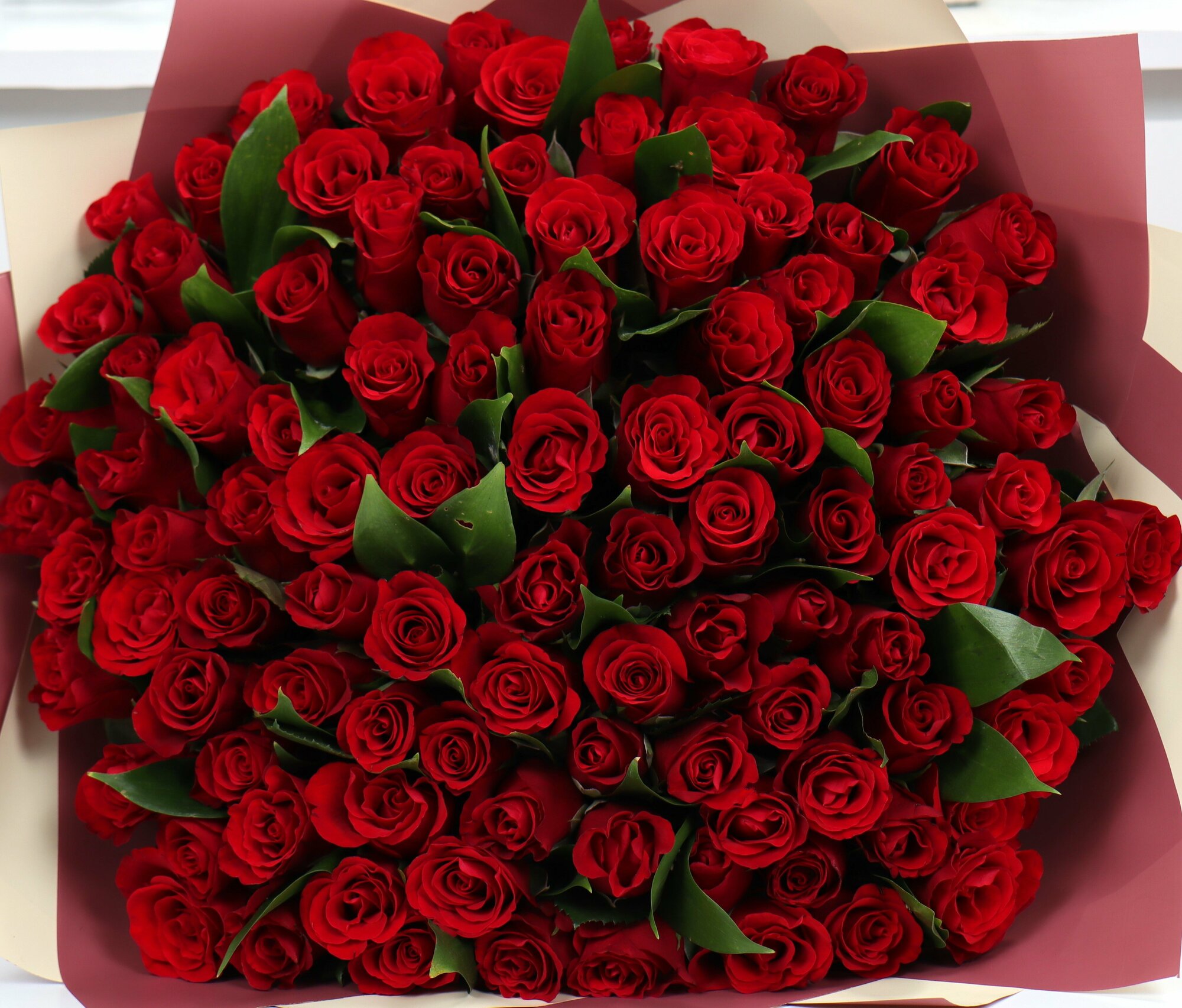 Купить 101 красная роза 40см с зеленью