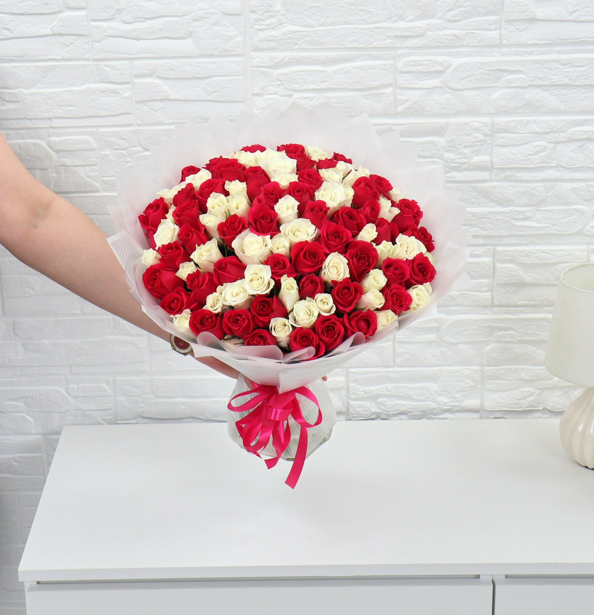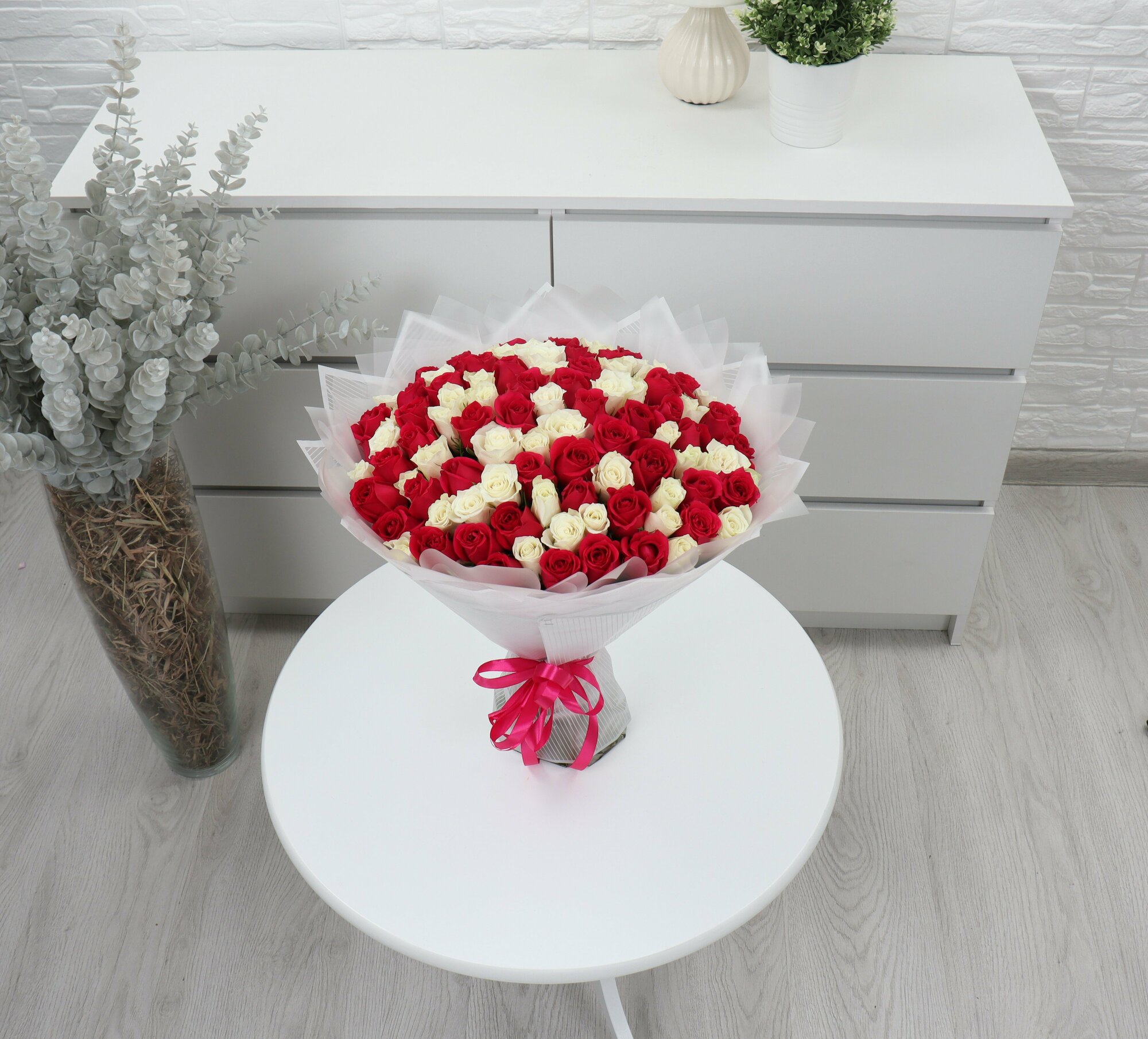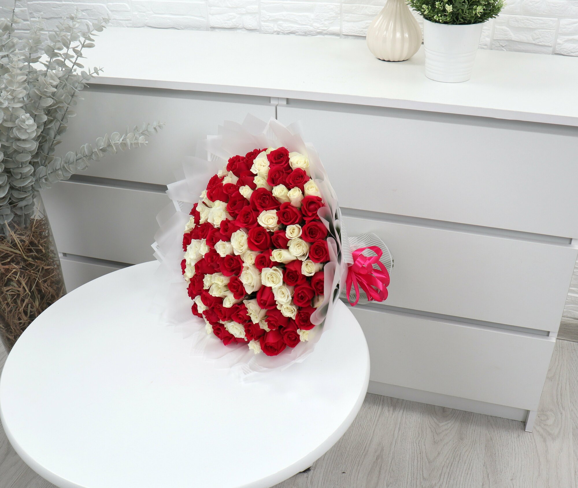 101 белая и малиновая роза 40см интересное:
