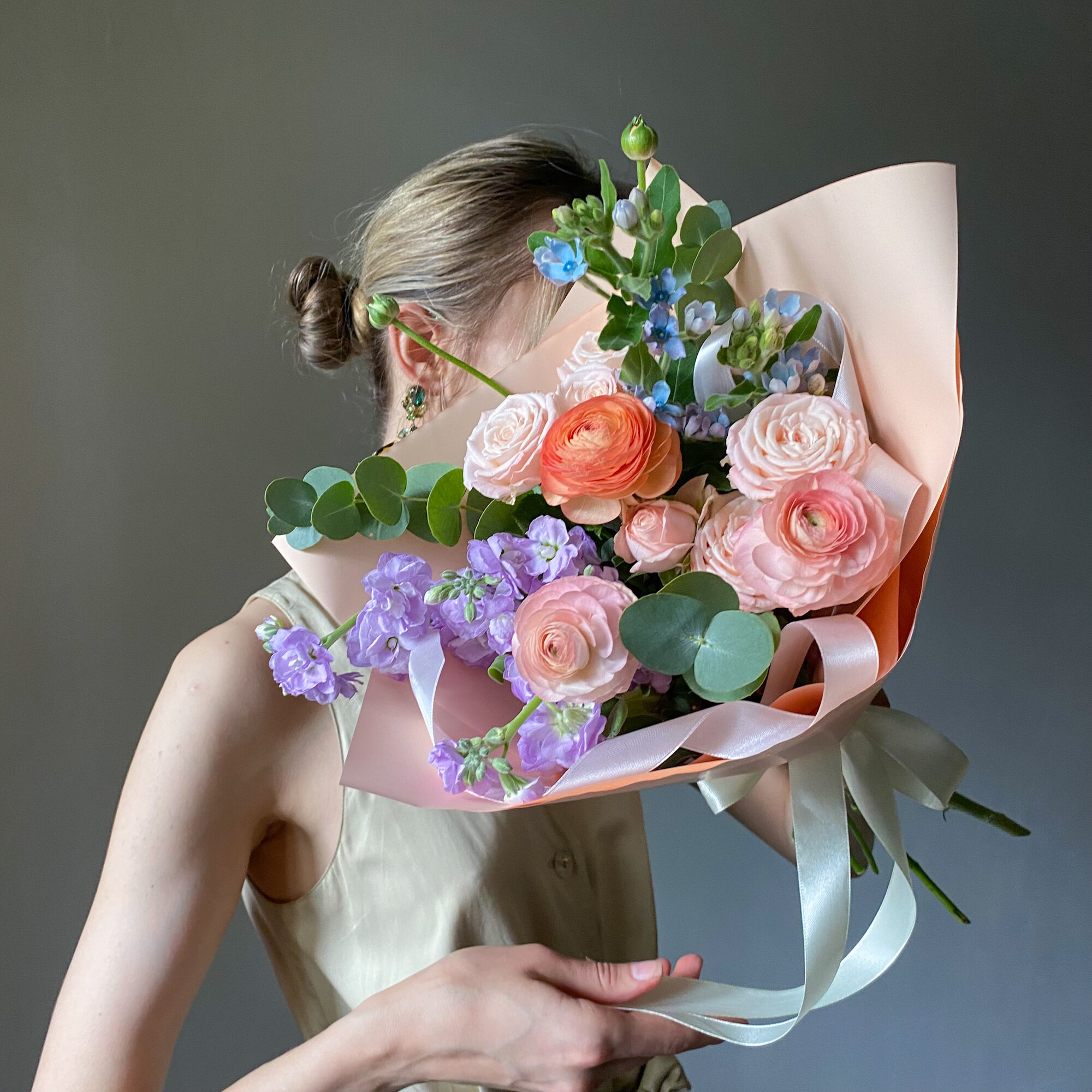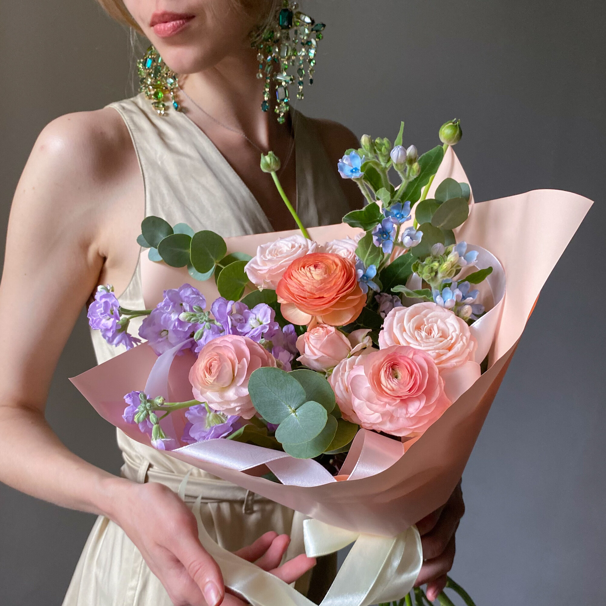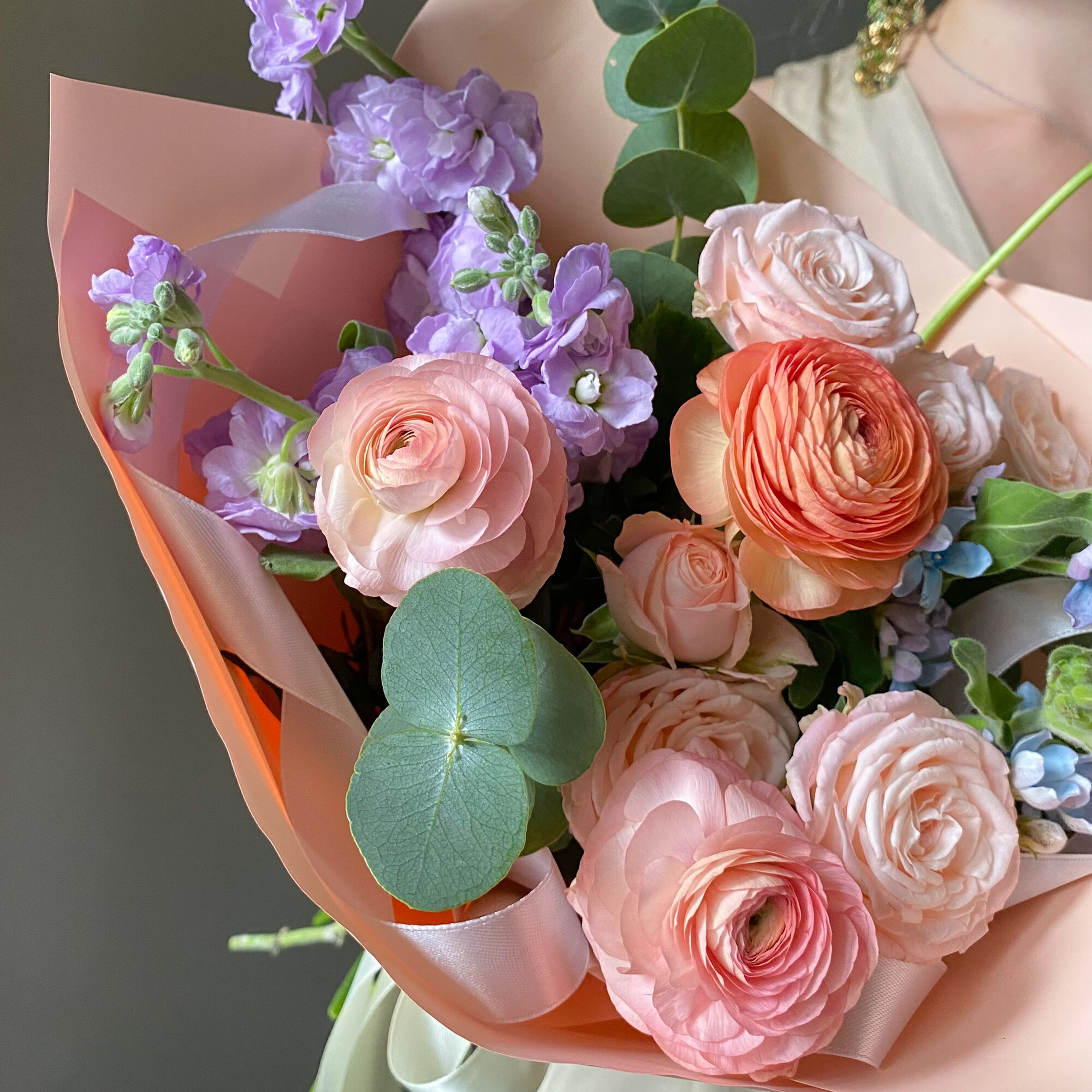 Авторский букет с персиковыми ранункулюсами, маттиолой и незабудками. Размер S интересное: