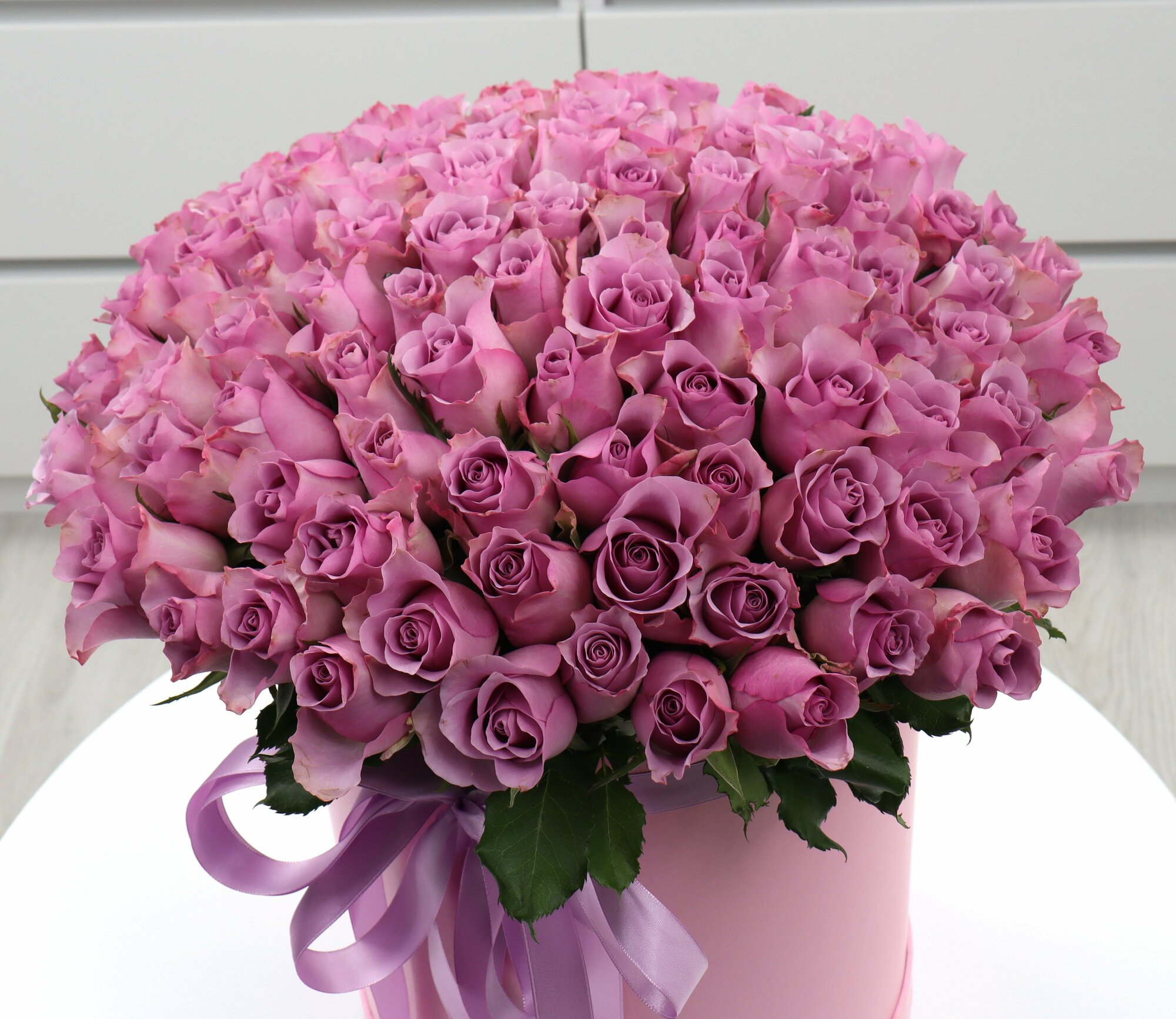 Купить 101 фиолетовая роза в шляпной коробке