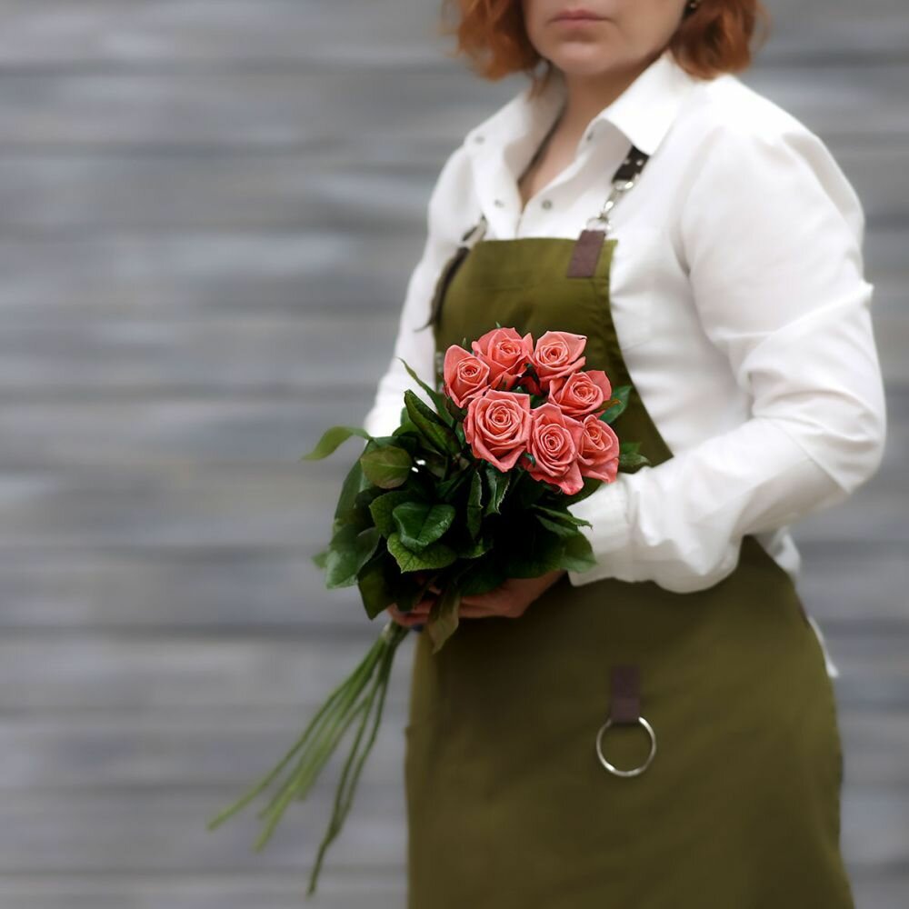 Купить Букет живых цветов из 7 коралловых роз (Россия) с лентой 60 см