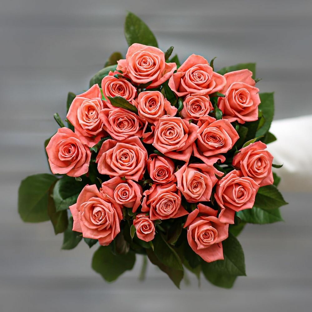 Купить Букет живых цветов из 21 коралловой розы (Россия) с лентой 60 см