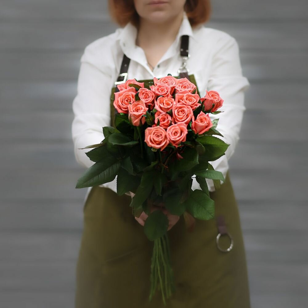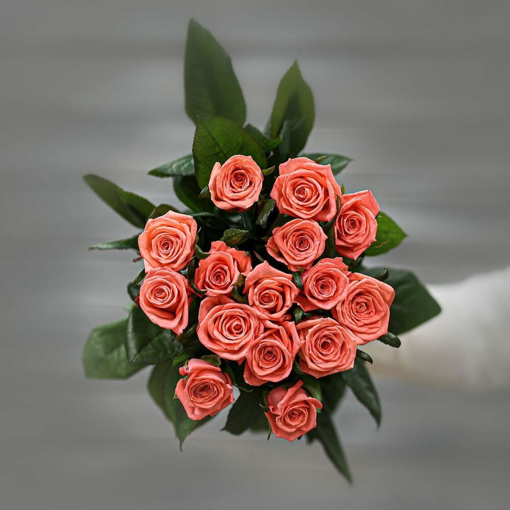 Букет живых цветов из 15 коралловых роз (Россия) с лентой 60 см