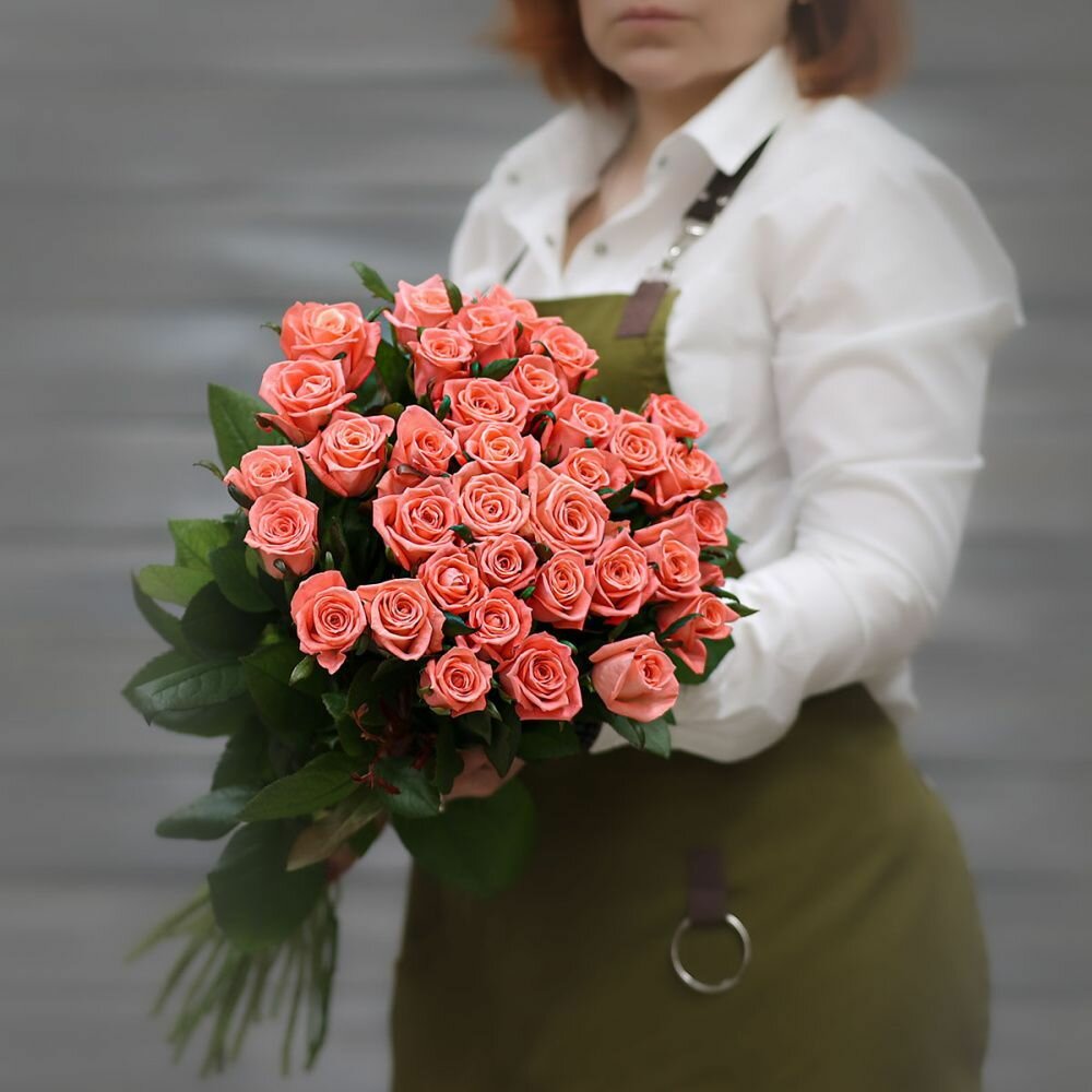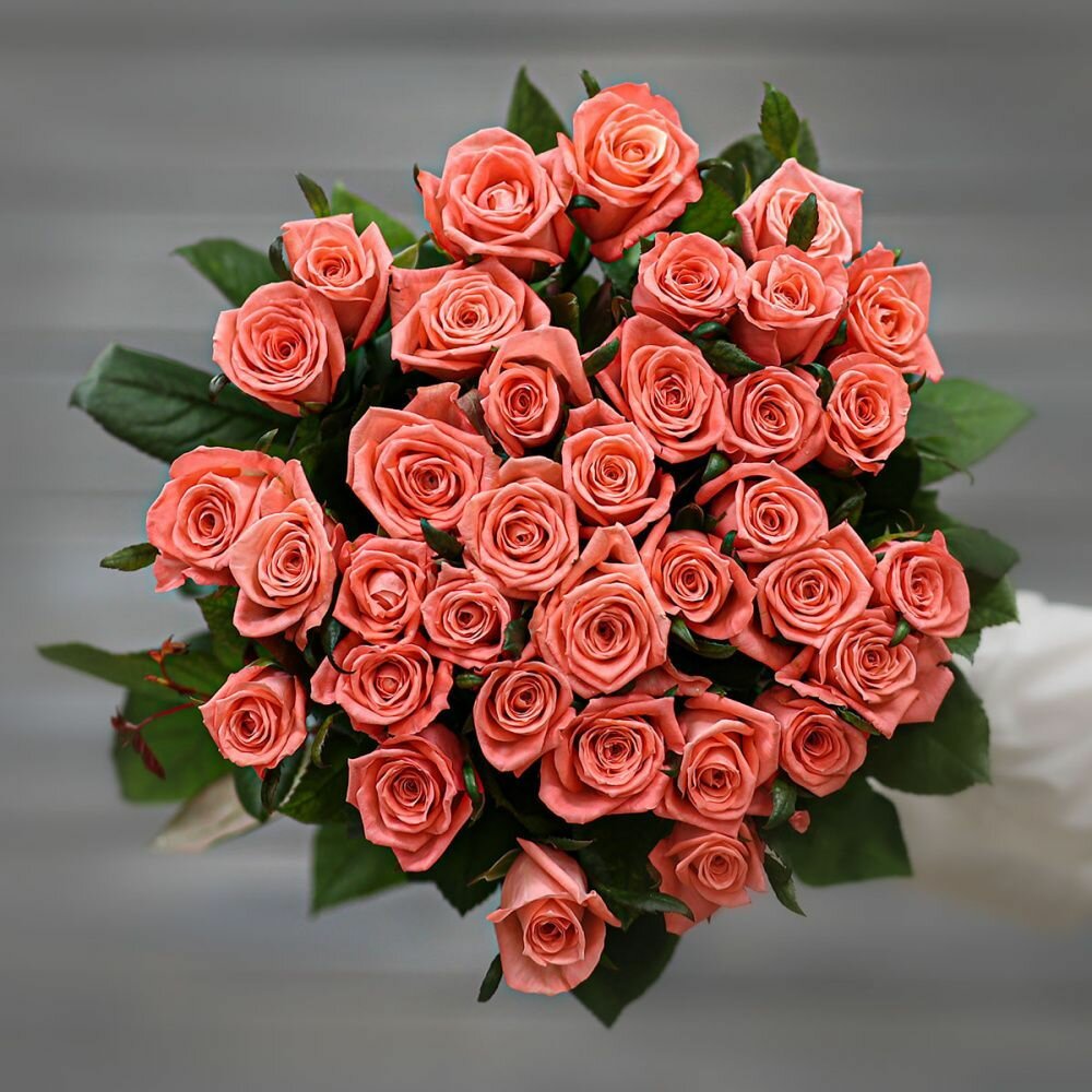 Букет живых цветов из 35 коралловых роз (Россия) с лентой 60 см