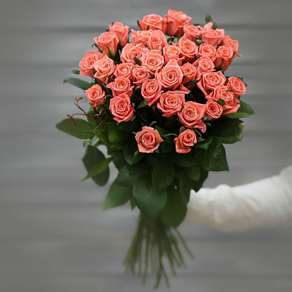СохранитьБукет живых цветов из 33 коралловых роз (Россия) с лентой 60 см интересное: