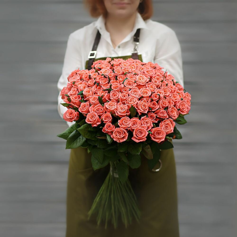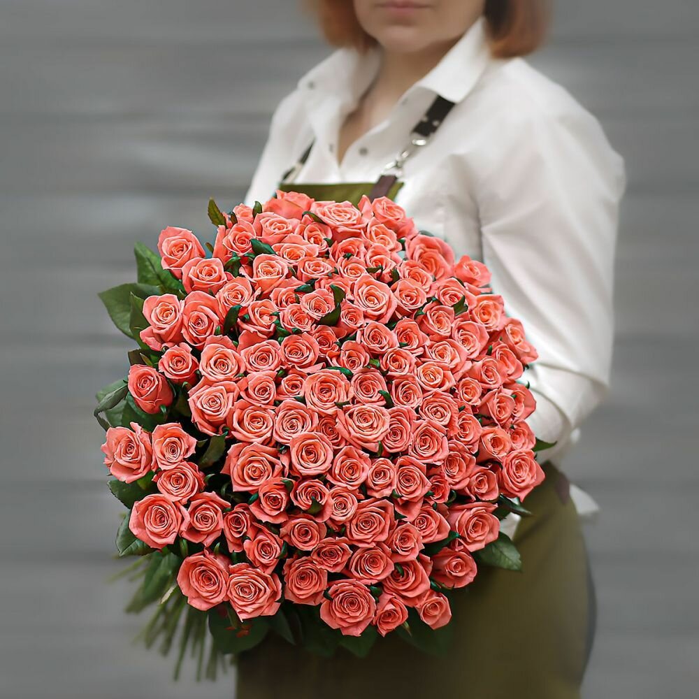 Купить Букет живых цветов из 101 коралловой розы (Россия) с лентой 60 см