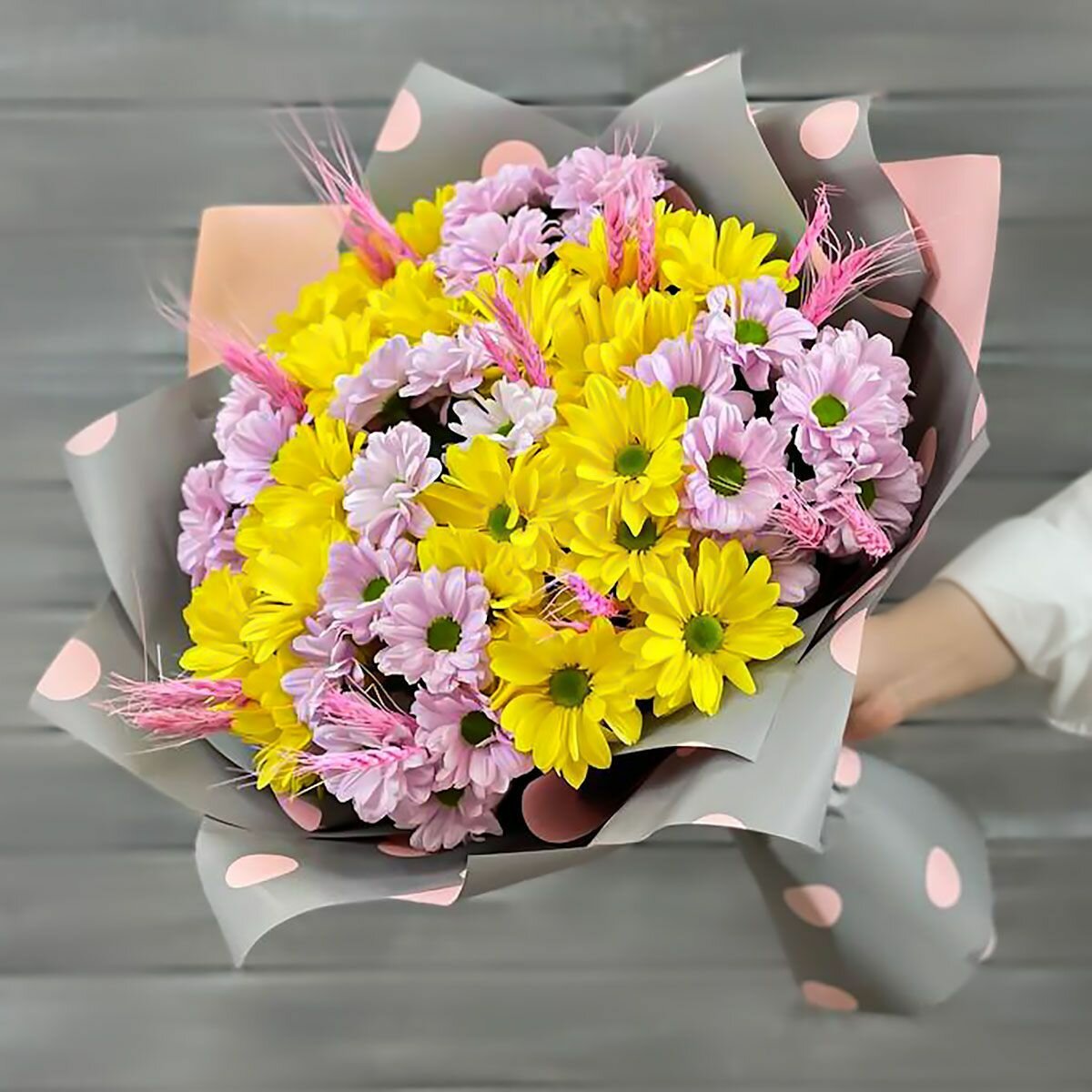 Купить Букет из живых цветов хризантем и колосков пшеницы