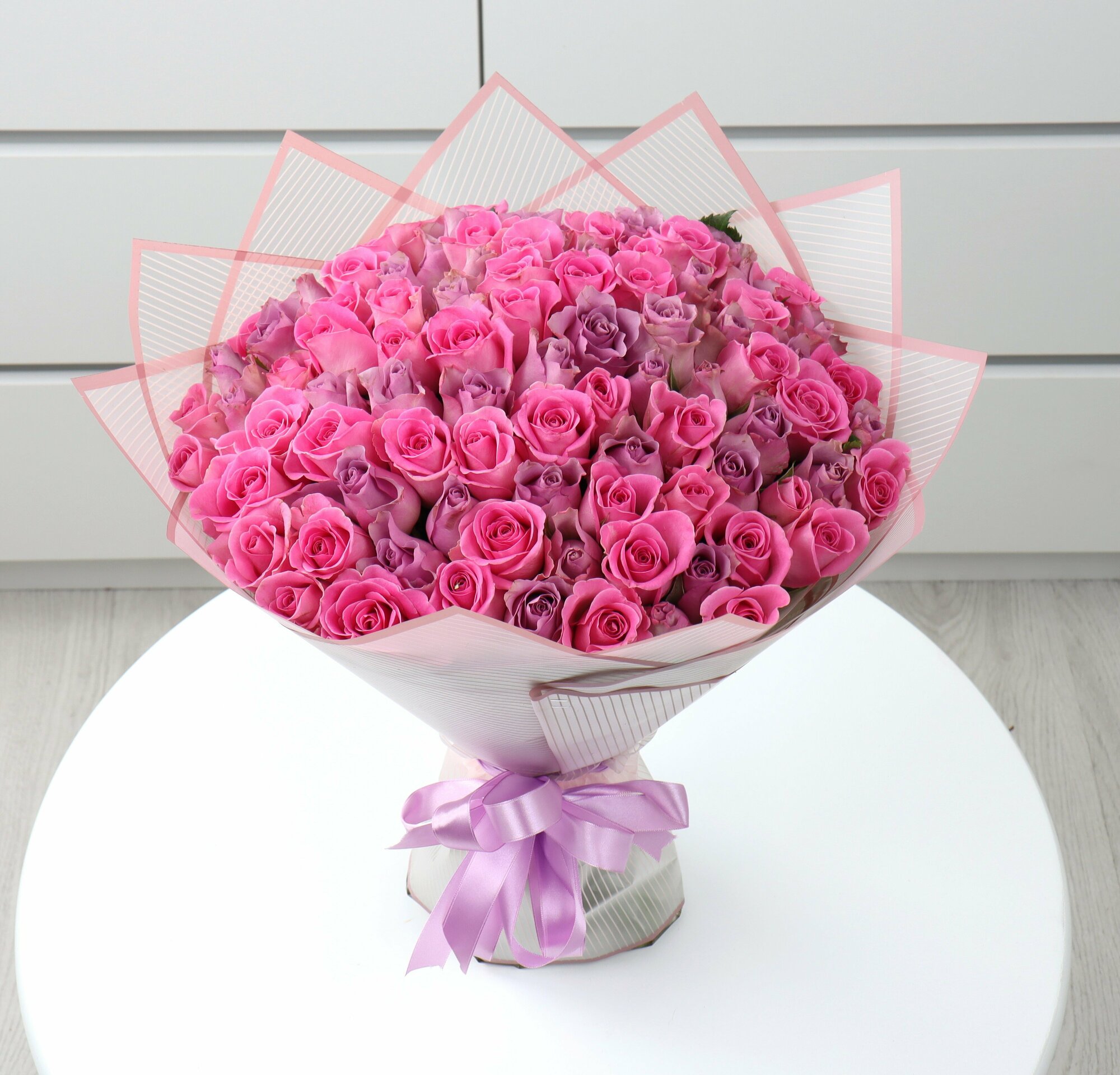 Купить 101 роза из розового и сиреневого цвета 40см