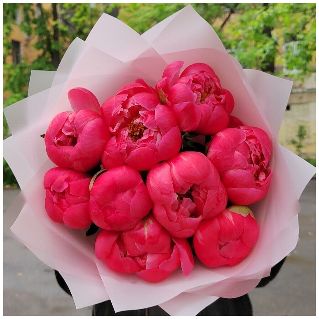Букет живых цветов из пионов, цвет красный, 11 шт, коралловые пионы арт 216