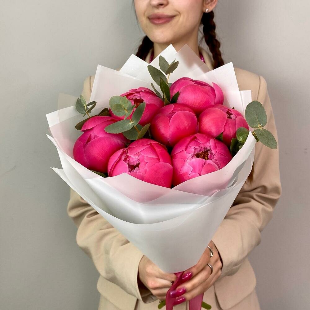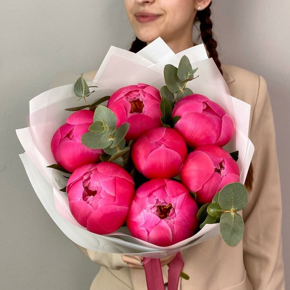 Купить Букет живых цветов из коралловых пионов и эвкалипта, цвет красный, 7 шт, арт 314