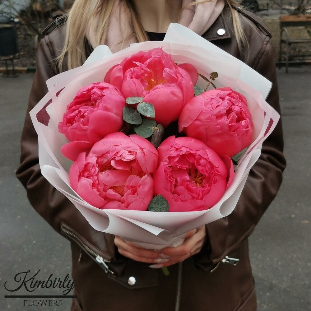 Купить Букет живых цветов из пионов, эвкалипта, цвет красный, 5 шт, коралловые пионы арт 217