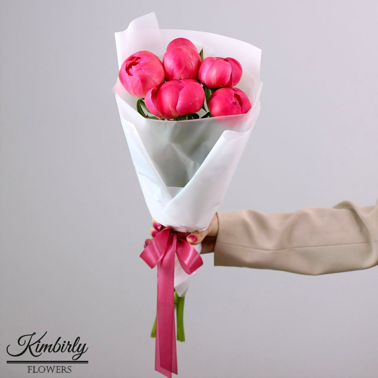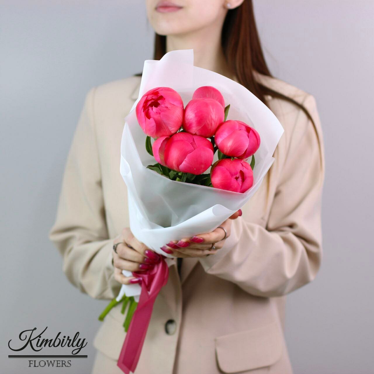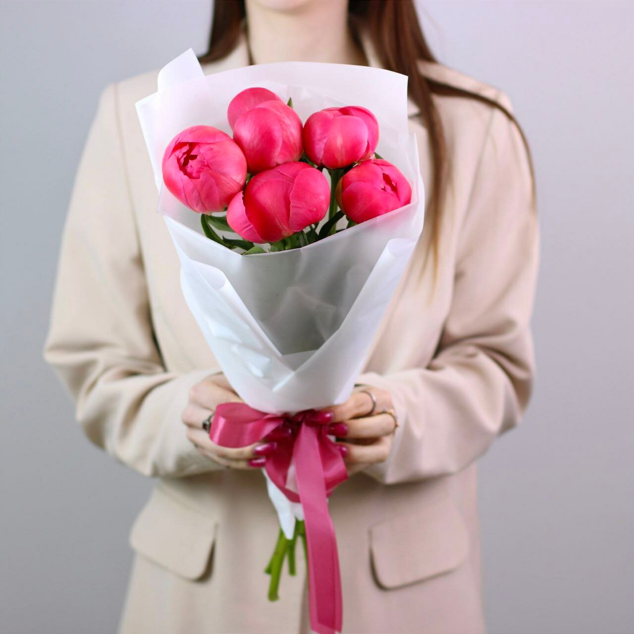 Купить Букет живых цветов из 5 коралловых пионов, цвет красный, кремовый
