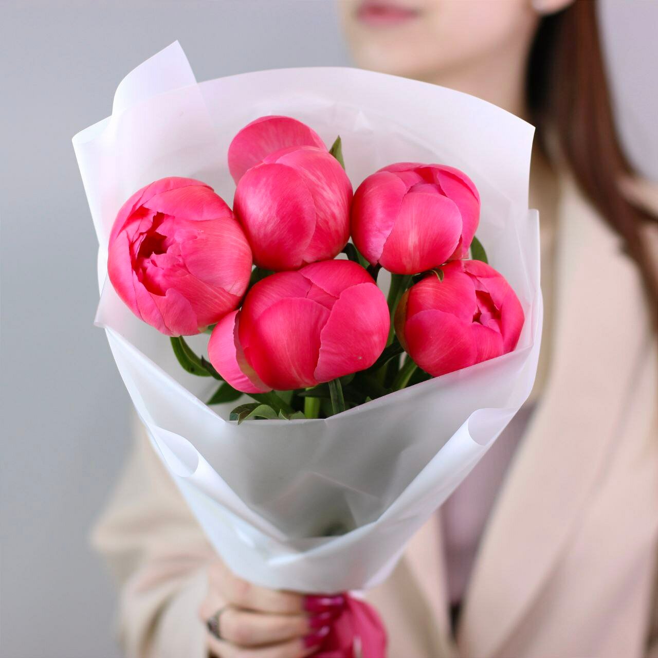 Букет живых цветов из пионов, цвет красный, 7 шт, коралловые пионы арт 215