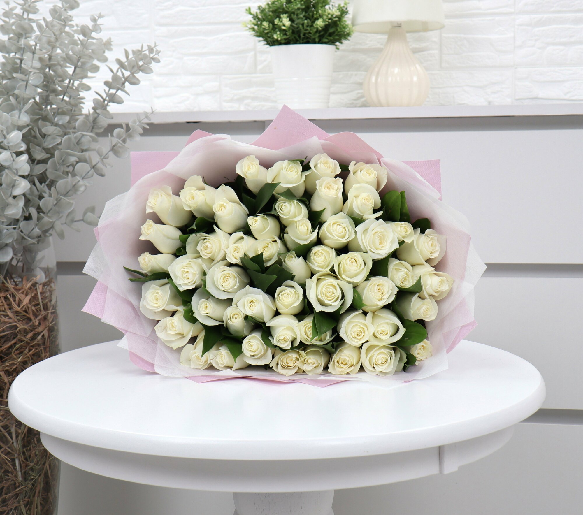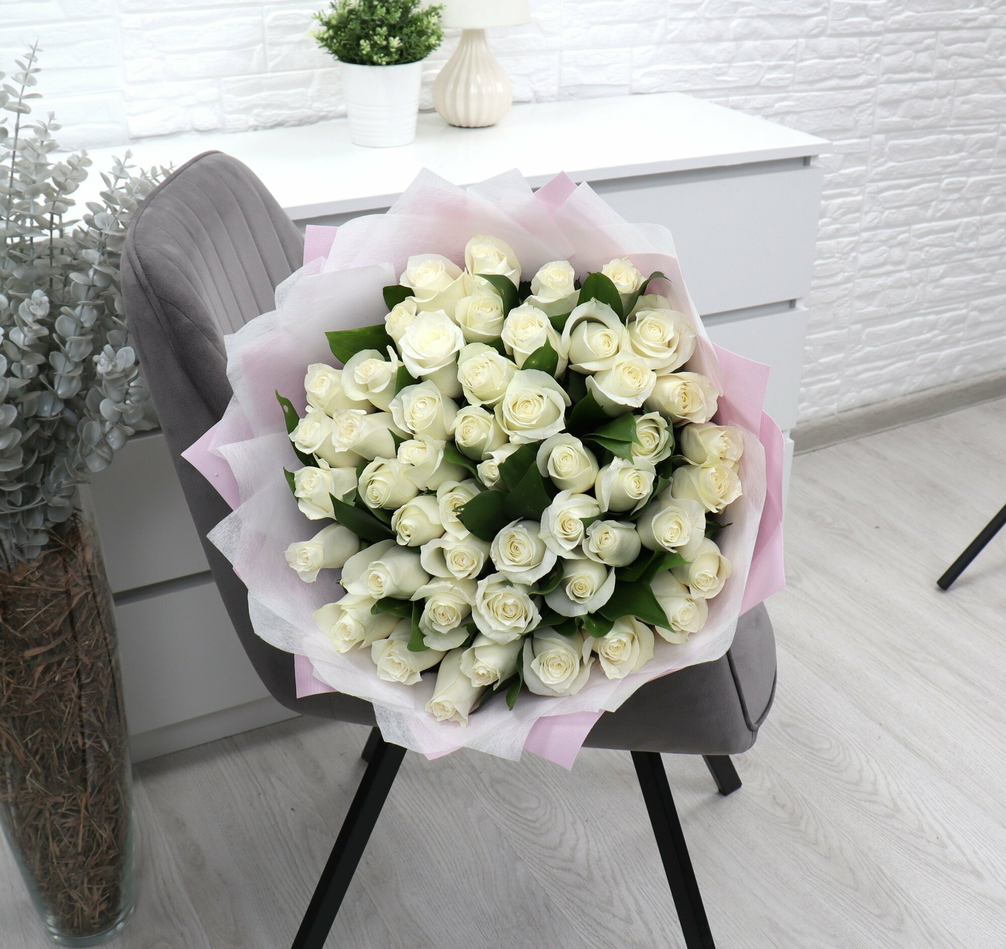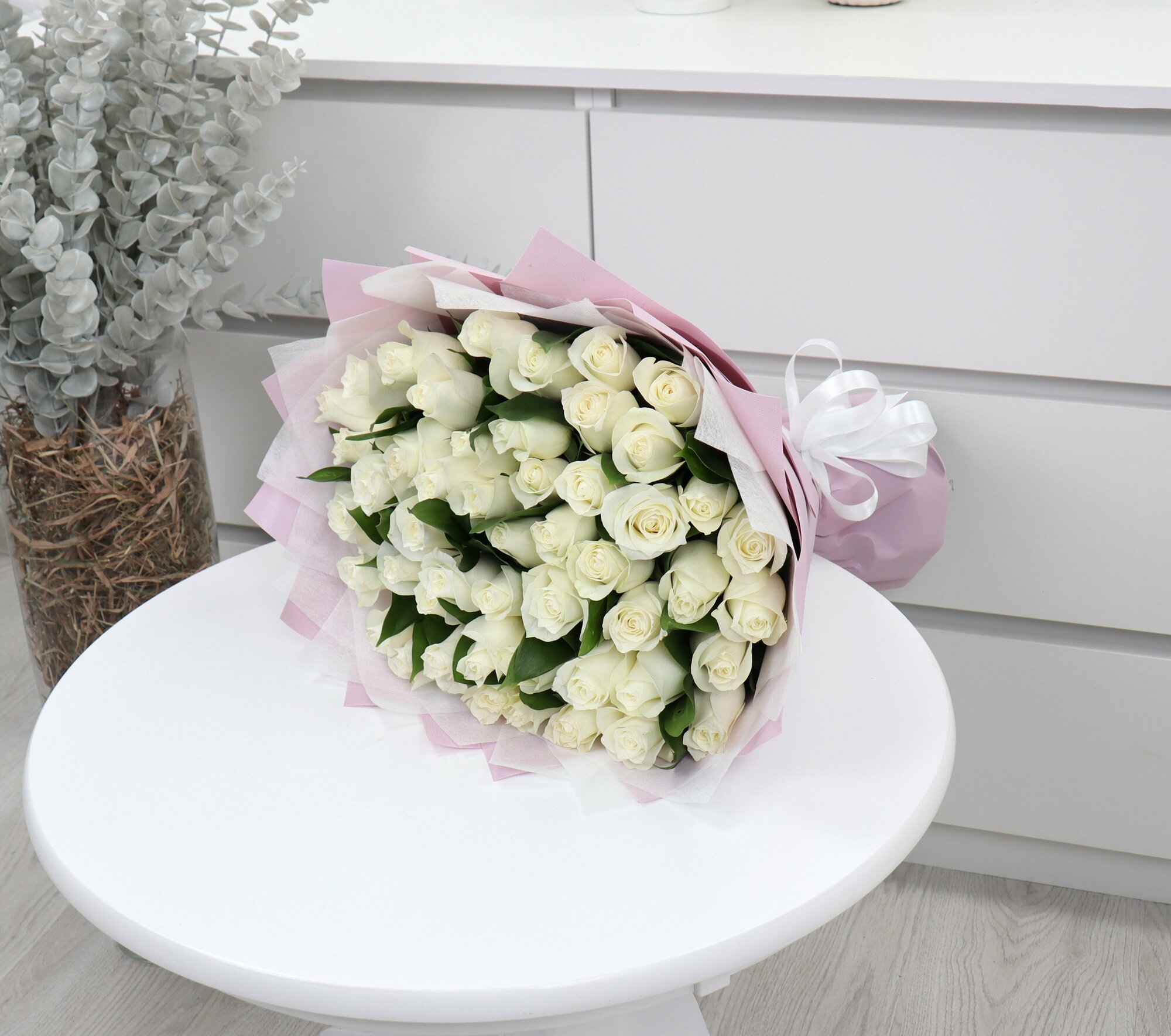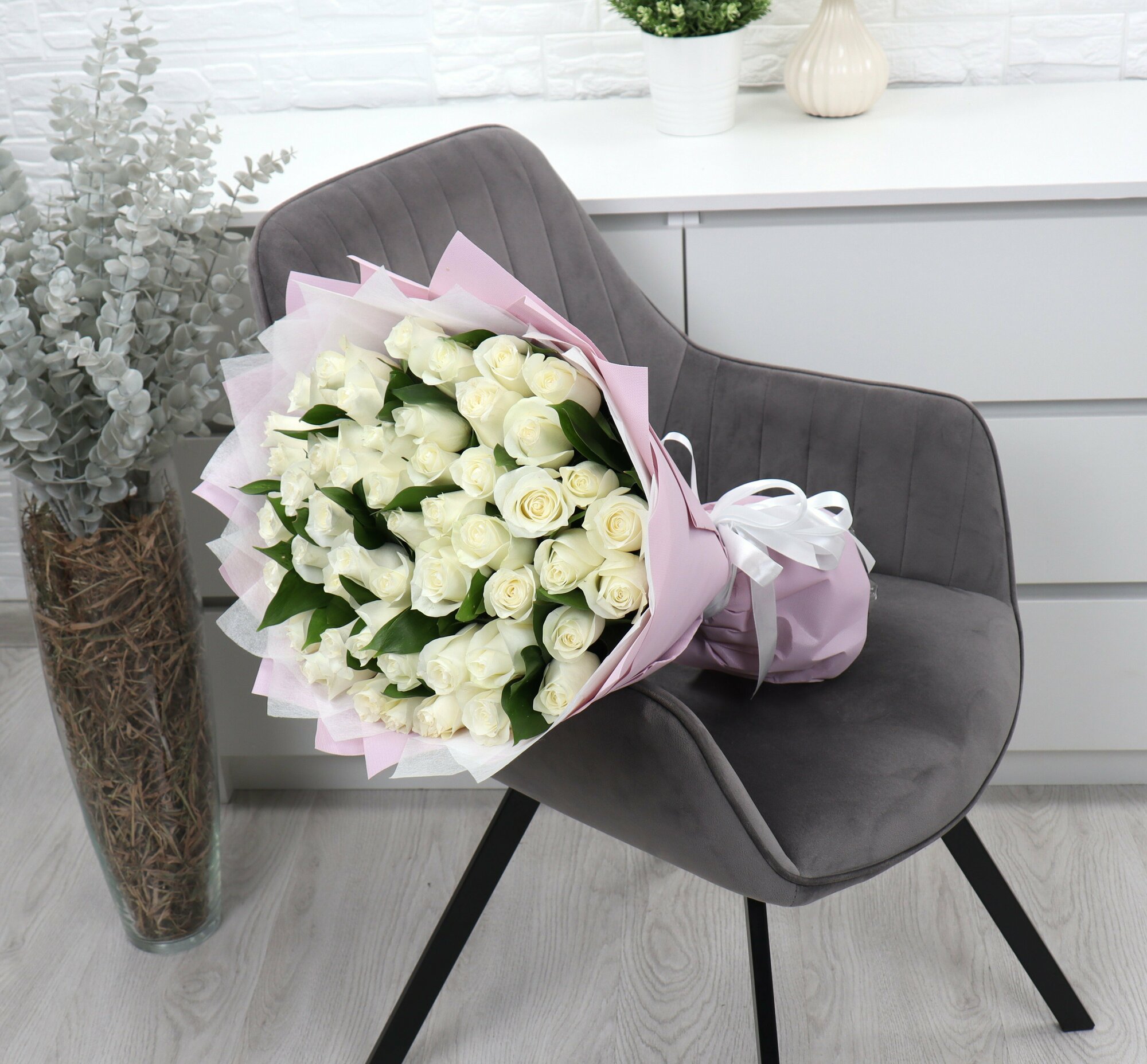 35 белых роз 40см с эвкалиптом