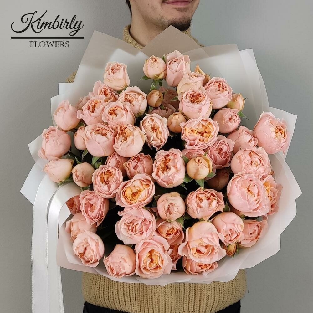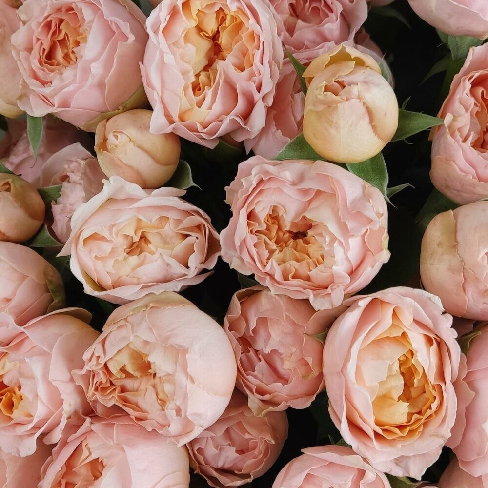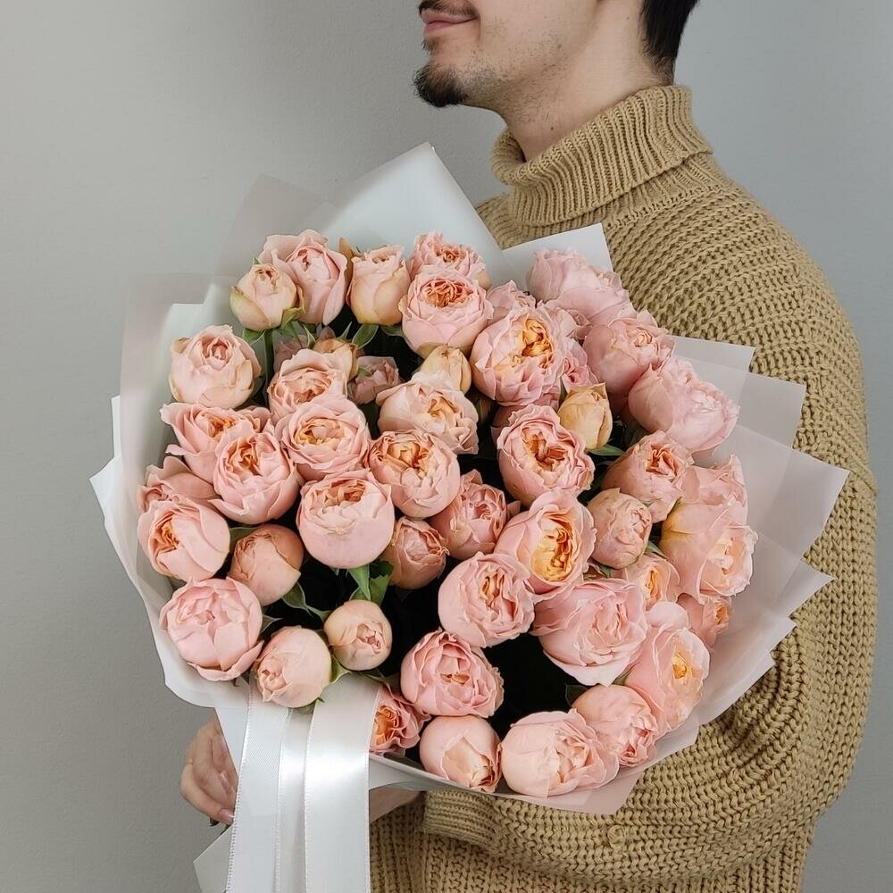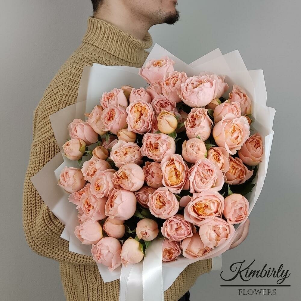 Купить Букет живых цветов из роз, цвет розовый, персиковый, 15 шт, кустовые пионовидные розы Джульетта арт 258