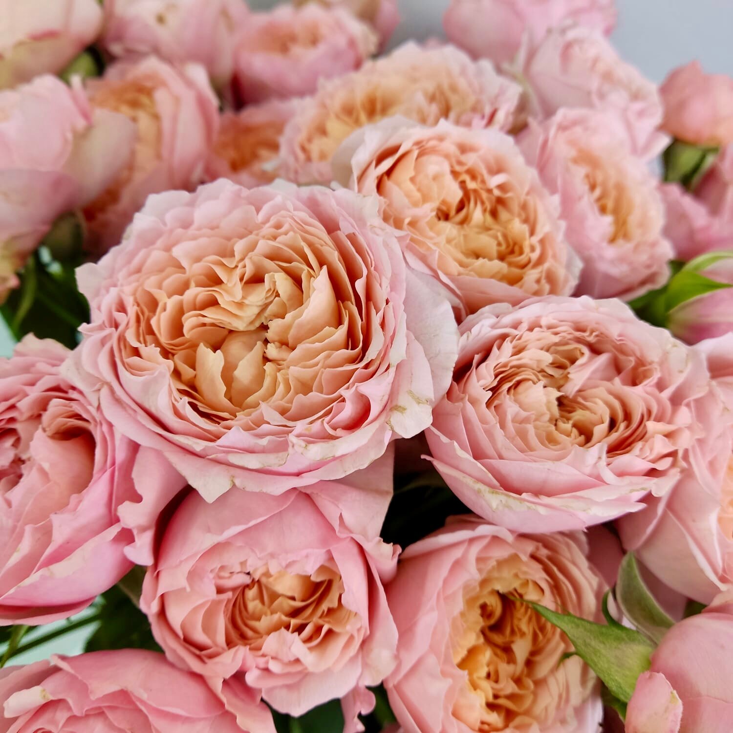 Букет живых цветов из роз, цвет розовый, персиковый, 15 шт, кустовые пионовидные розы Джульетта арт 258