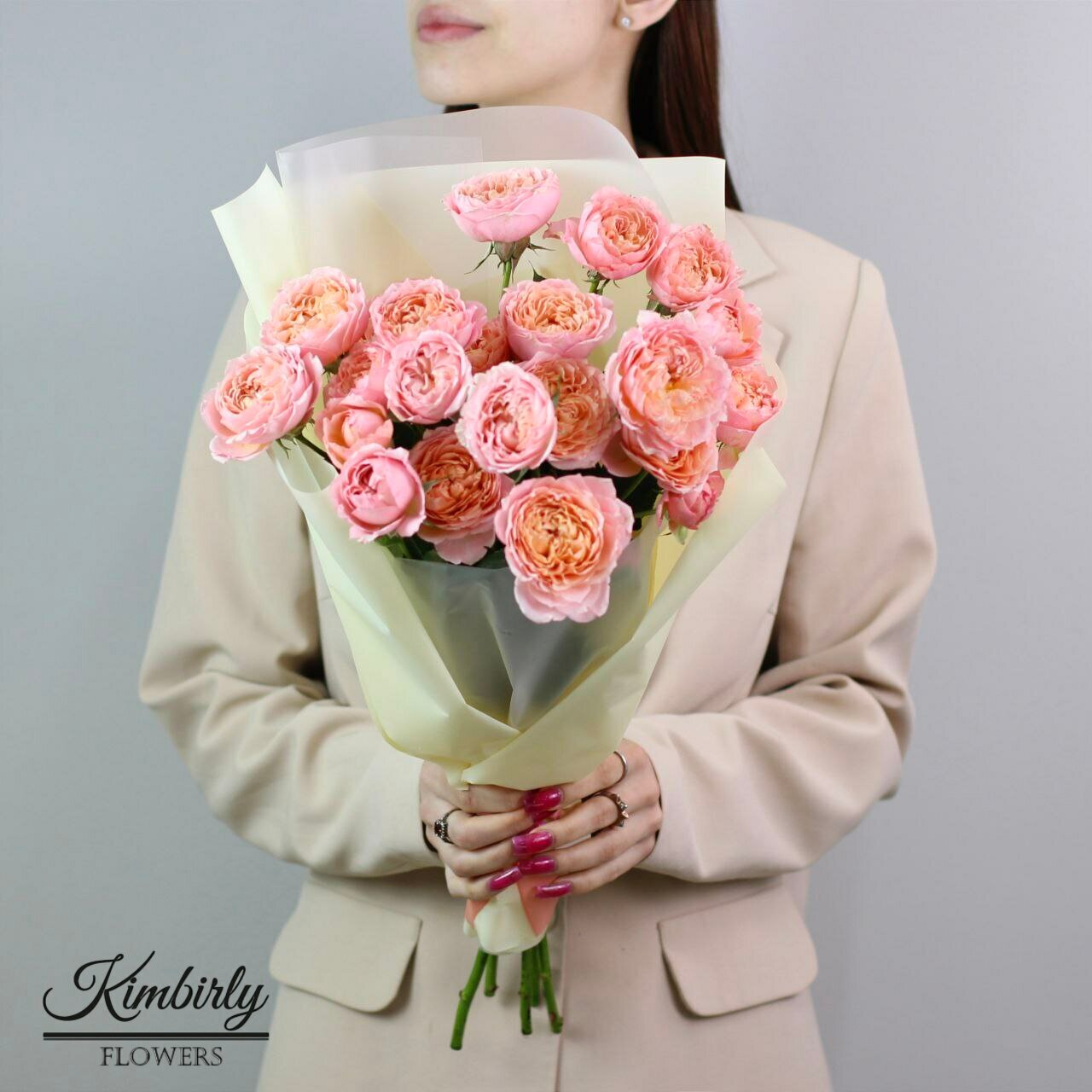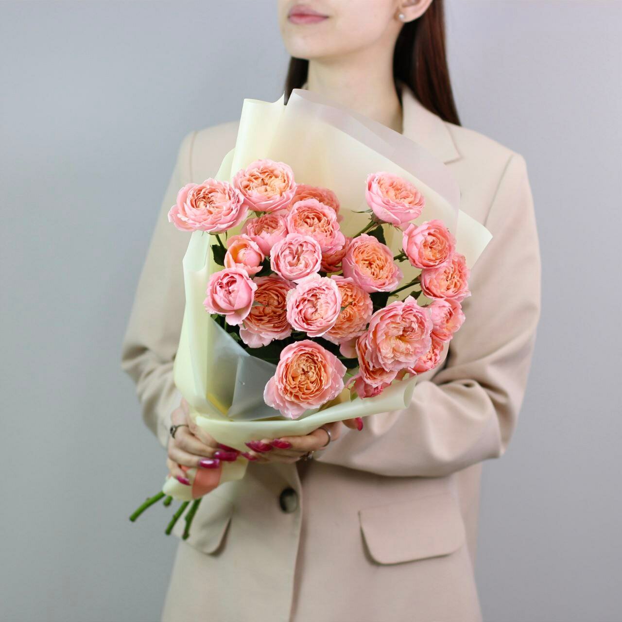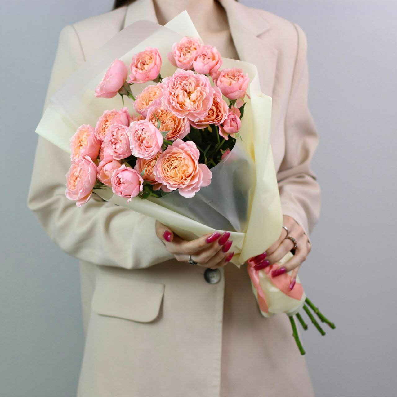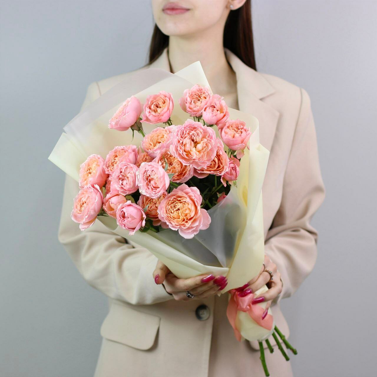 Букет живых цветов из роз, цвет розовый, персиковый, 11 шт, кустовые пионовидные розы Джульетта арт 176