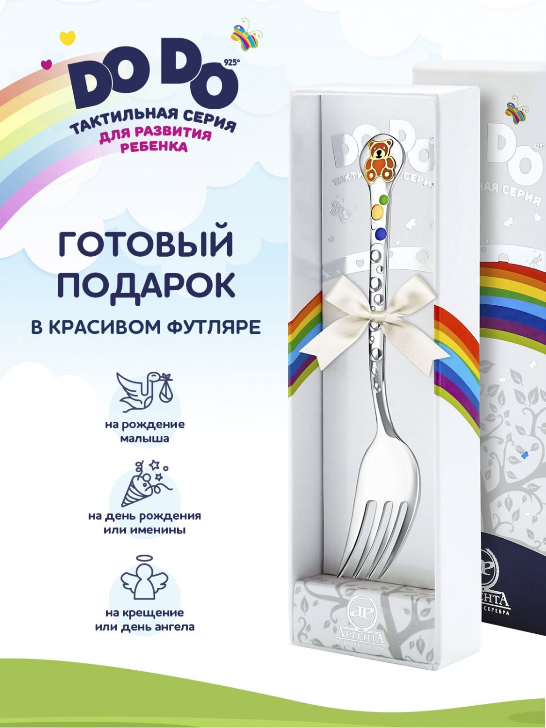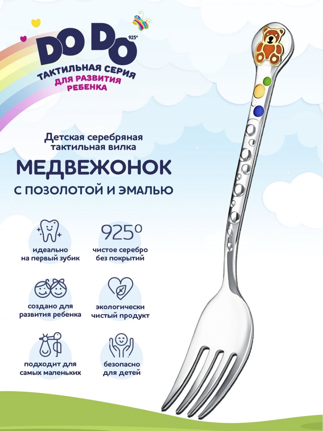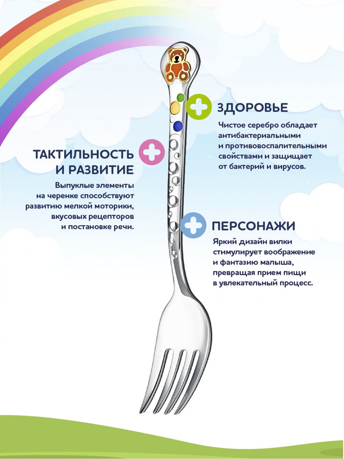 Вилка детская серебряная для кормления "Медвежонок" с позолотой с оранжевой эмалью в футляре интересное:
