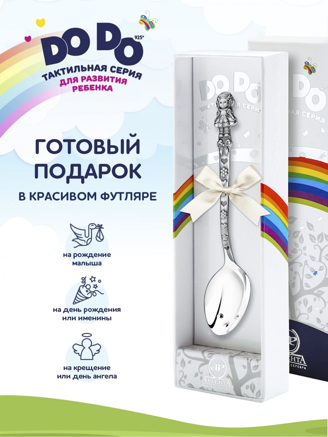 Серебряная ложка детская для кормления "Кукла с бантами" с чернением в футляре интересное:
