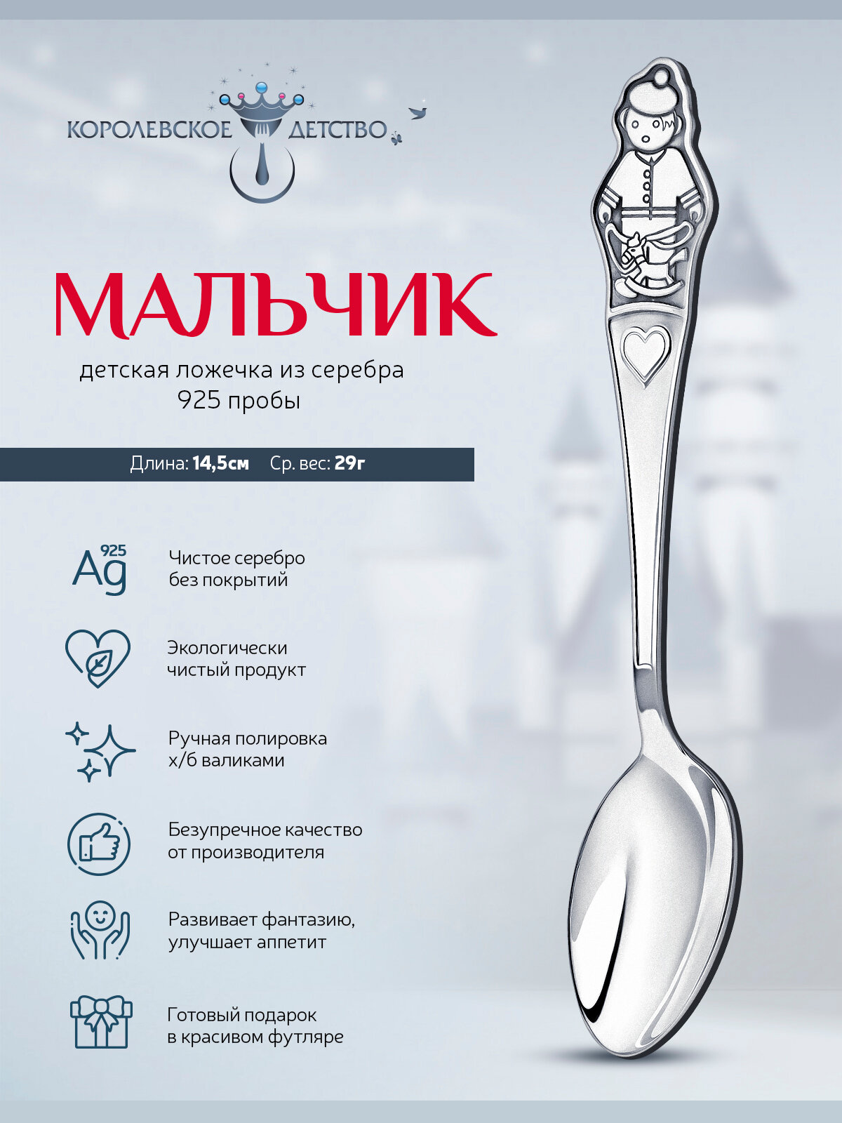 Купить Ложка чайная "Мальчик" серебряная с чернением в футляре