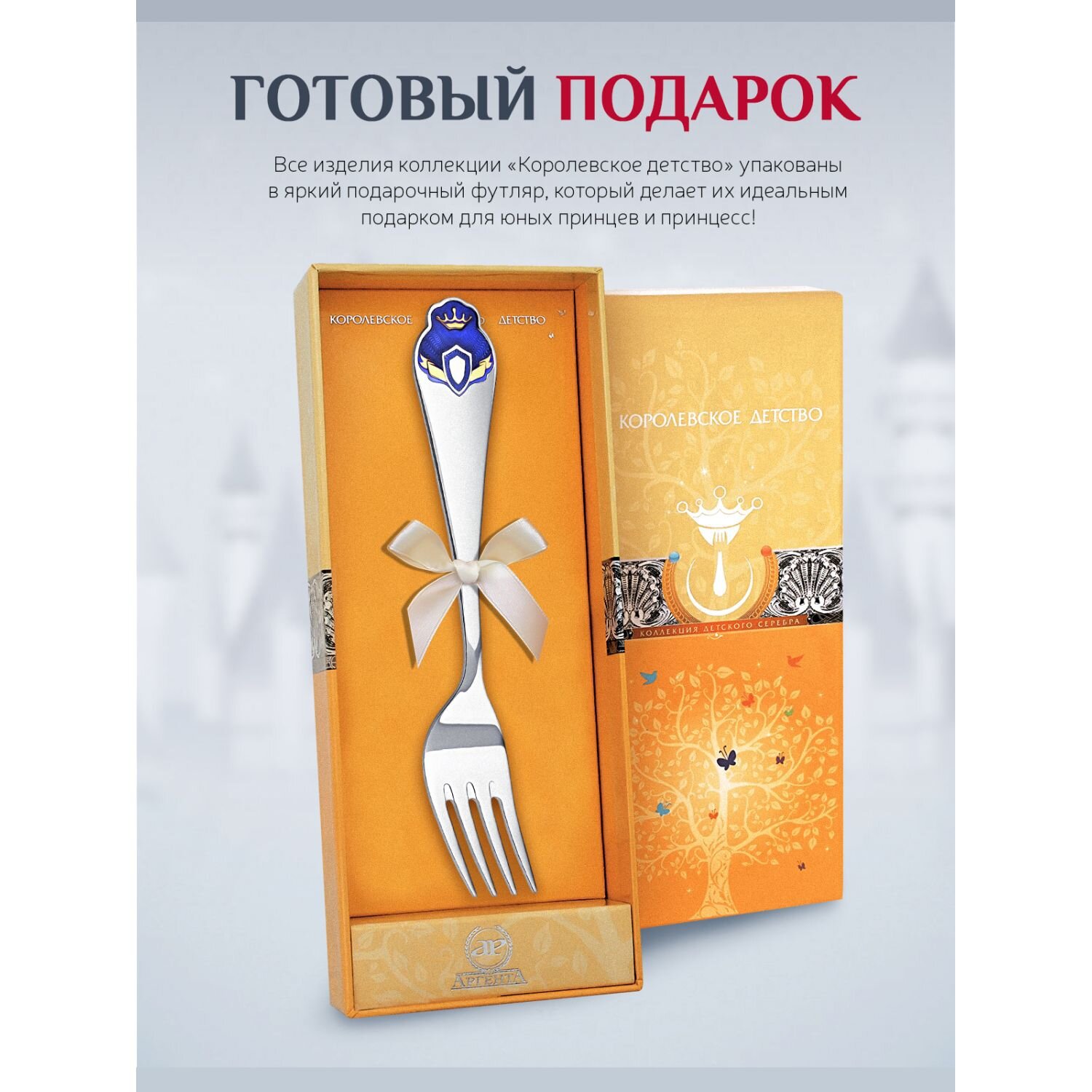 Серебряная вилка детская "Принц" с позолотой с эмалью в футляре интересное: