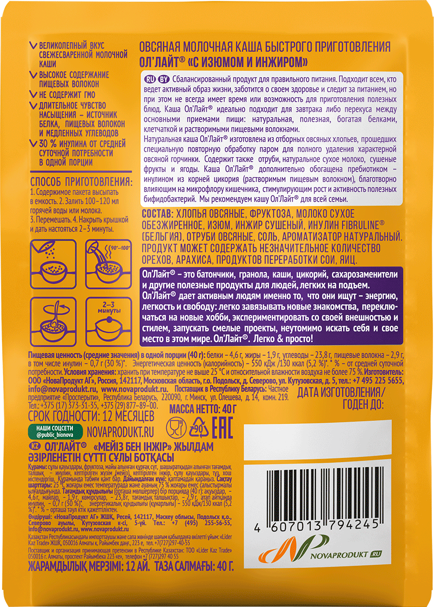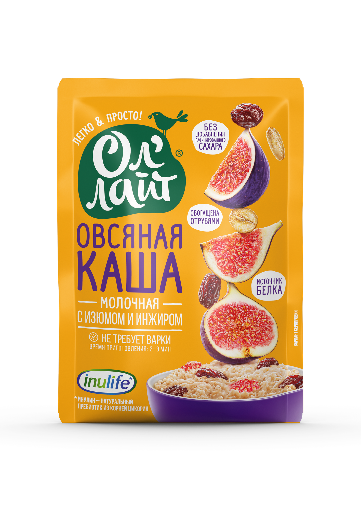 Купить Овсяная молочная каша быстрого приготовления "Ол'Лайт" с изюмом и инжиром в пакетиках 22шт по 40г.